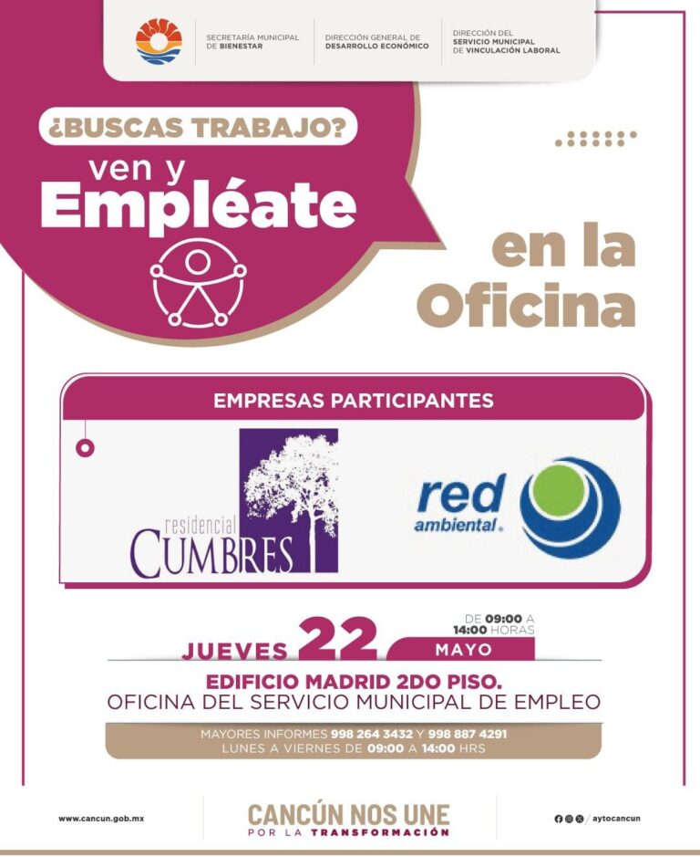 Cancún, Q. R., a 20 de mayo de 2025.- Con la prioridad de facilitar el vínculo para que los ciudadanos obtengan un empleo digno y formal, el Ayuntamiento de Benito Juárez, a través de las direcciones de Desarrollo Económico y…