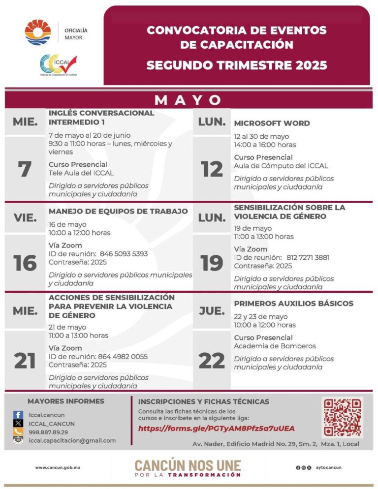 Cancún, Q. R., a 06 de mayo de 2025.- A través de dos cursos de capacitación en este mes de mayo, el Ayuntamiento de Benito Juárez, a través del Instituto de Capacitación en Calidad (ICCAL) promueve la prevención de la…