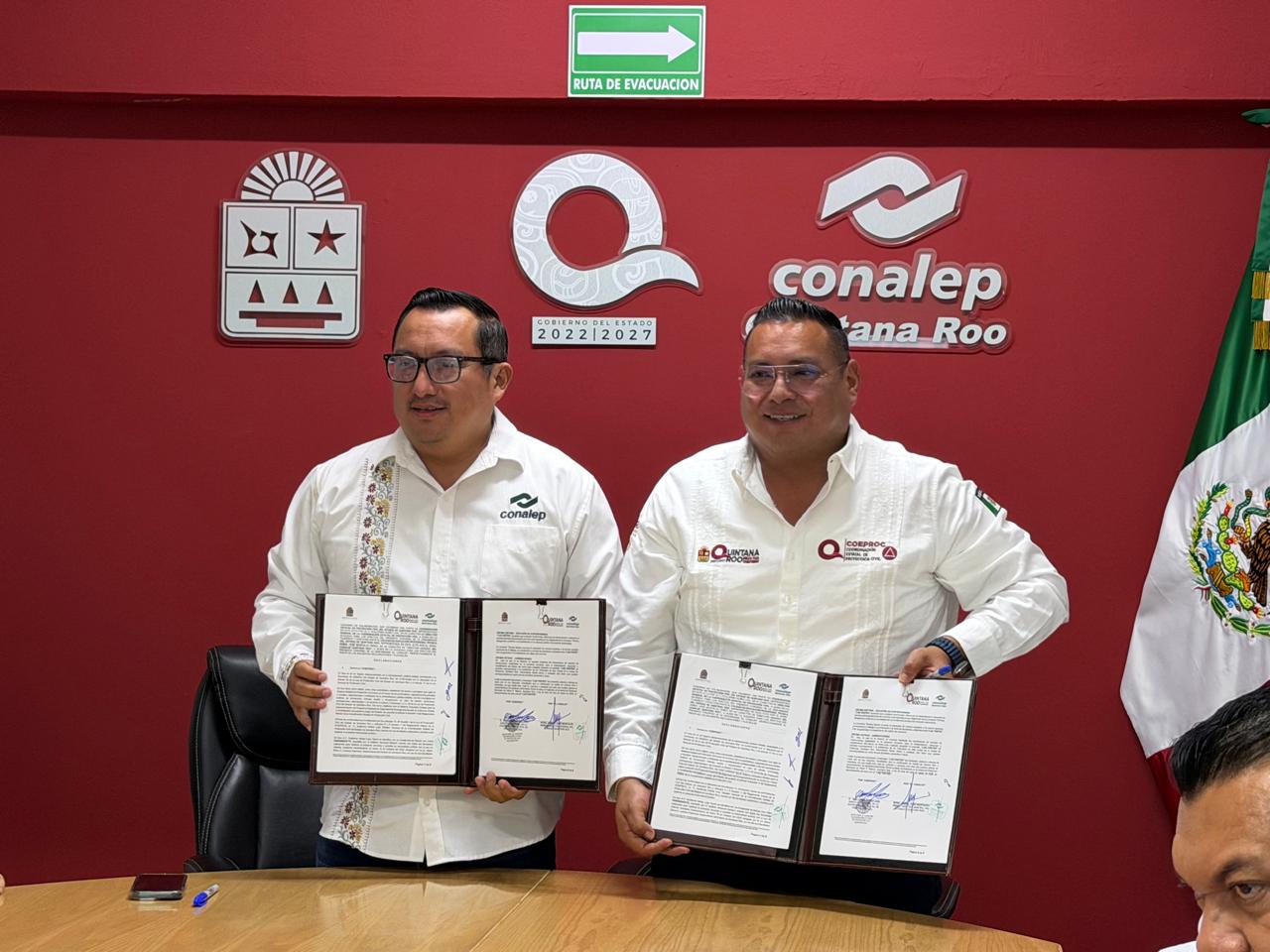 Chetumal.- Bajo la instrucción de la gobernadora Mara Lezama Espinosa de fortalecer la seguridad escolar, los titulares de la Coordinación Estatal de Protección Civil (COEPROC), Guillermo Núñez Leal y del Colegio Nacional de Educación Profesional Técnica (CONALEP), Aníbal Montalvo, firmaron el convenio de colaboración por un Modelo de Planteles Resilientes en Quintana Roo, el cual refleja el compromiso del Gobierno del Estado y del sistema educativo por fortalecer la cultura de la prevención y la protección de la vida.