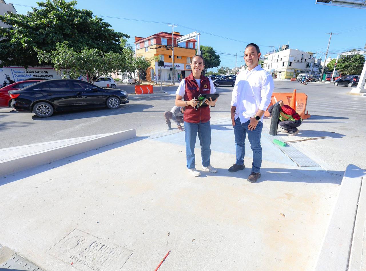 “En este cruce Av. La Luna con Av. Nichupté prácticamente era imposible hacer el cruce peatonal, porque en esta área no había banquetas, todo el camellón estaba completo y eso hacía muy difícil que una persona en silla de ruedas o una señora con carriola pudiera cruzar la calle, estos semáforos eran de los más antiguos que se tenían y a parte no se tenían cruces semaforizados”, destacó la Alcaldesa.