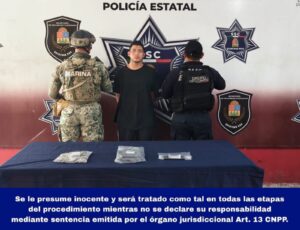 En Benito Juárez, en un inmueble de la colonia Rancho Viejo, los elementos participantes aseguraron hierba verde seca y fragmentos sólidos blancos; asimismo, fue detenido Manuel “N”, señalado como presunto distribuidor de droga en el lugar.