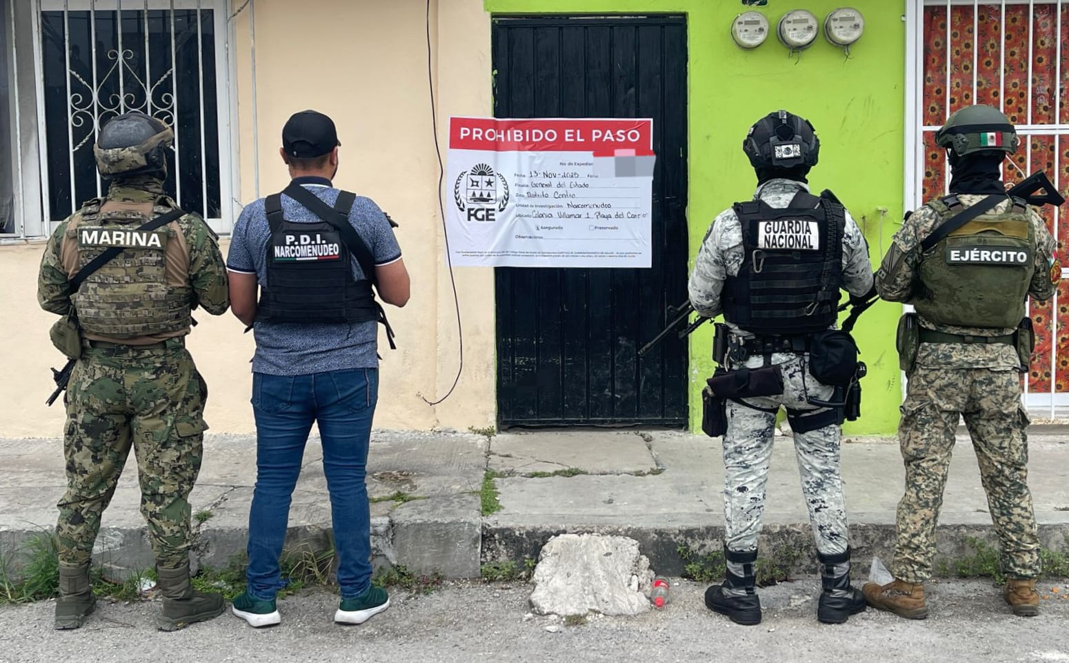 Benito Juárez.- Personal de la Fiscalía General del Estado, en coordinación con elementos de la Defensa, Guardia Nacional y Secretaría de Marina, cumplimentó cinco órdenes de cateo giradas por jueces de control: dos en este municipio y tres más en Cozumel. En estos lugares, los agentes participantes aseguraron posibles estupefacientes y lograron la detención en flagrancia de 11 personas, por su presunta relación en hechos probablemente constitutivos de delitos contra la salud en su modalidad de narcomenudeo.