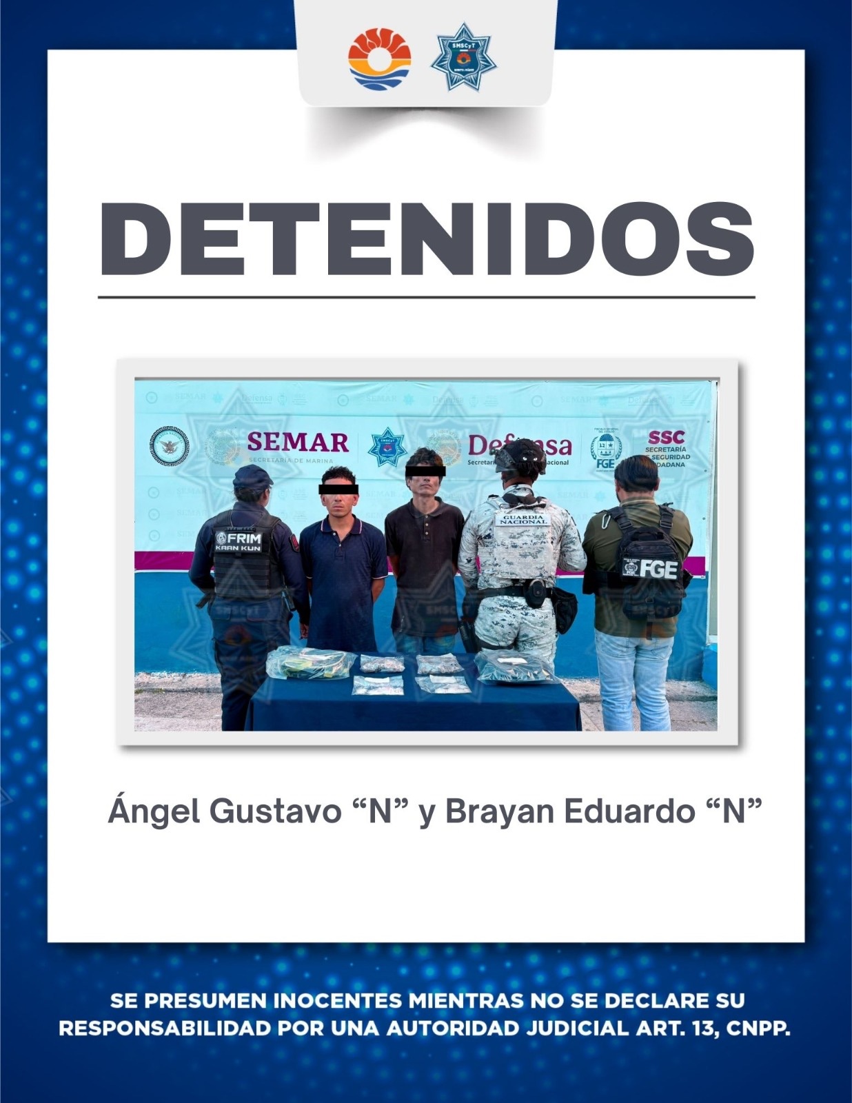 Ángel Gustavo “N”, de 23 años de edad, y Bryan Eduardo “N”, de 32 años, fueron detenidos y puestos a disposición de la Fiscalía General del Estado para los trámites legales correspondientes.
