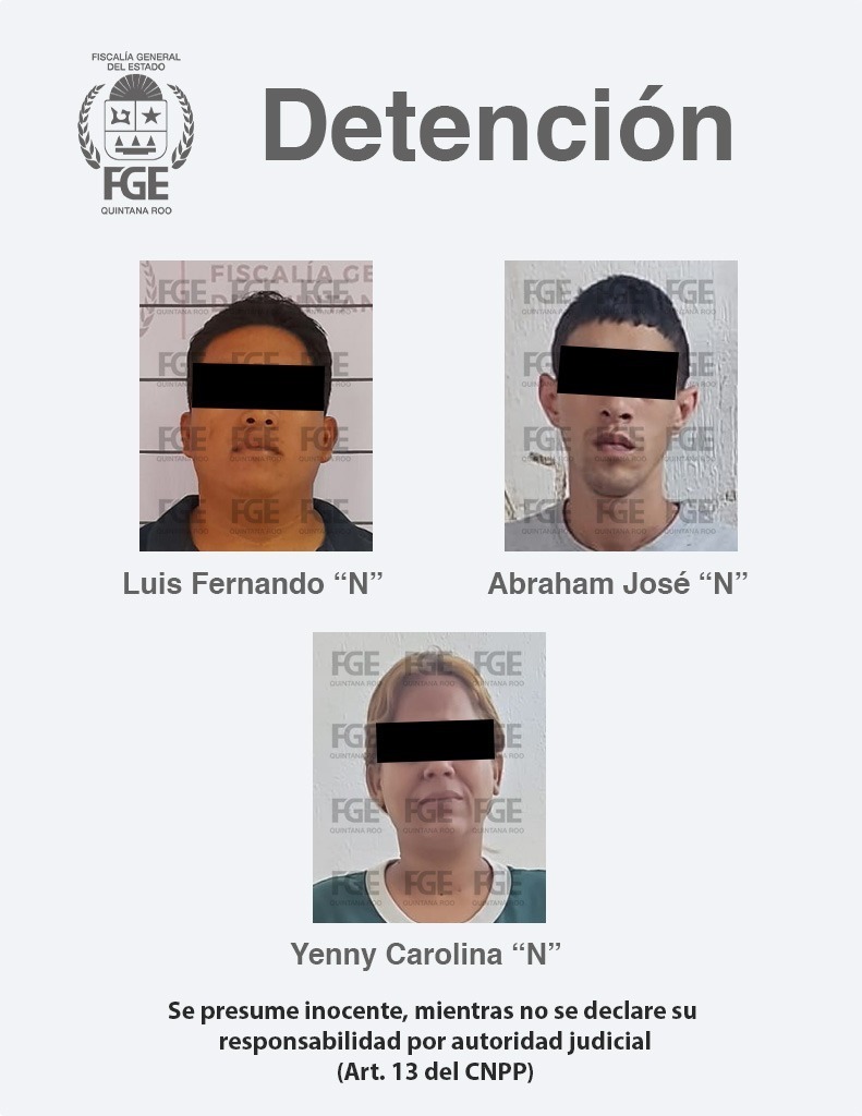 Othón P. Blanco.- La Fiscalía General del Estado informa que, elementos de la Policía de Investigación, derivado de trabajos de investigación, detuvieron a Luis Fernando “N”, Abraham José “N” y Yenny Carolina “N” por su posible comisión en hechos posiblemente constitutivos de delitos contra la salud en su modalidad de narcomenudeo, en este municipio.