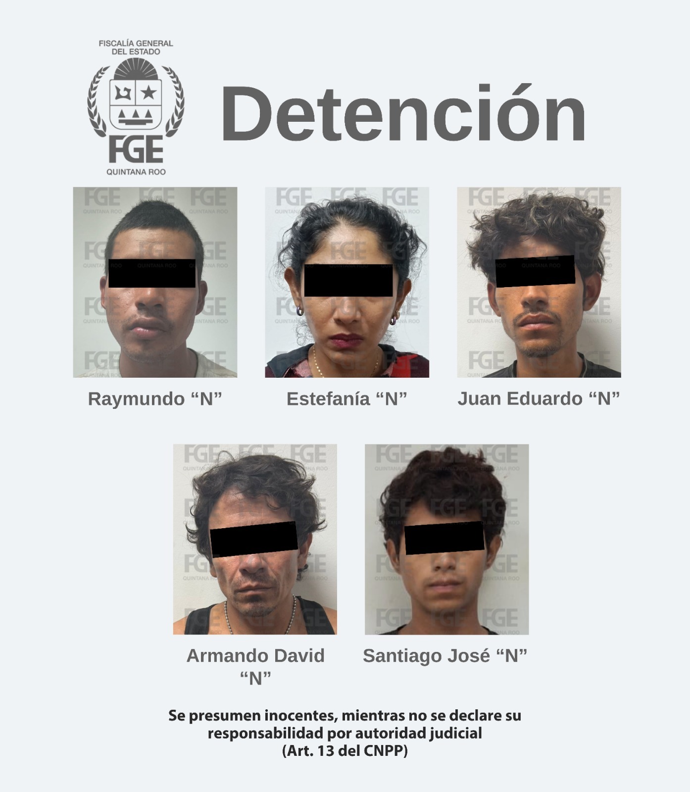 Benito Juárez.– La Fiscalía General del Estado informa que, derivado de trabajos de investigación, en coordinación con elementos de la Guardia Nacional y Policía Municipal, detuvo en flagrancia a cinco personas por su probable participación en hechos posiblemente constitutivos del delito de narcomenudeo, en este municipio.