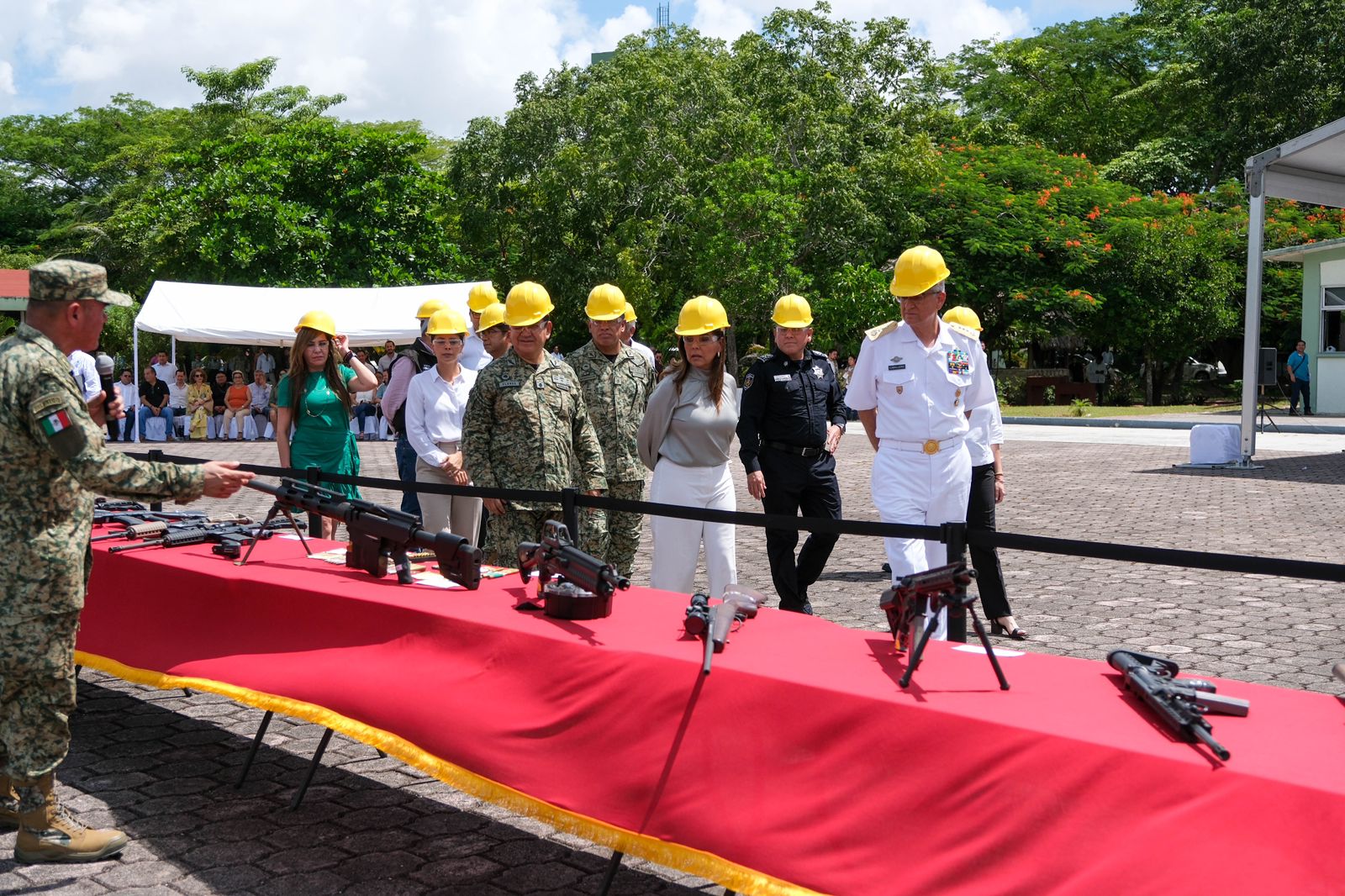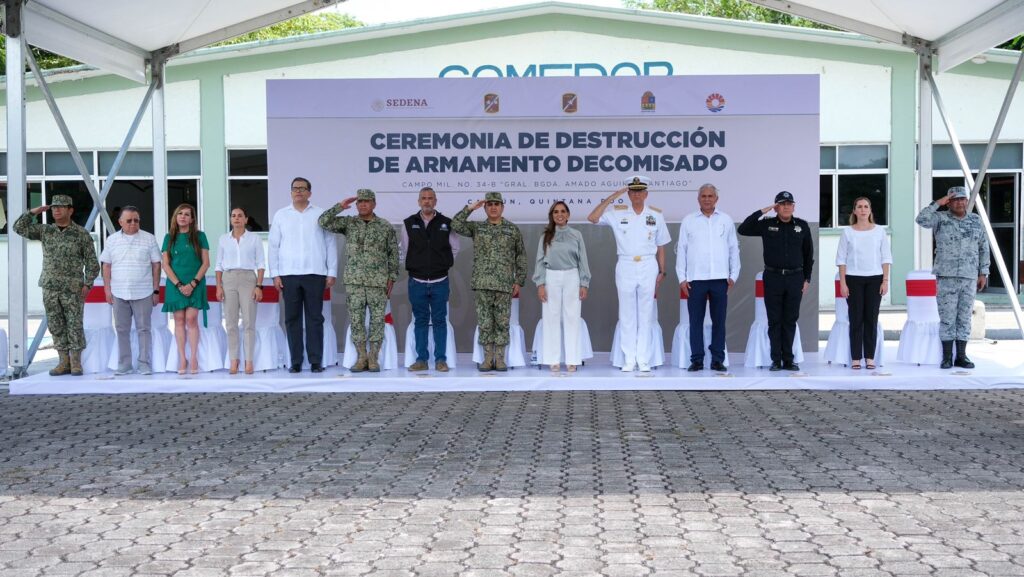 Cancún.- Al inutilizar y destruir armas que de otra forma podrían usarse en contra de ciudadanas y ciudadanos avanzamos en la estrategia de construcción de paz, afirmó la gobernadora Mara Lezama Espinosa al atestiguar la ceremonia para la destrucción de armamento asegurado y puesto a disposición de la Secretaría de la Defensa Nacional (SEDENA), en las instalaciones de la Guarnición Militar de Cancún.