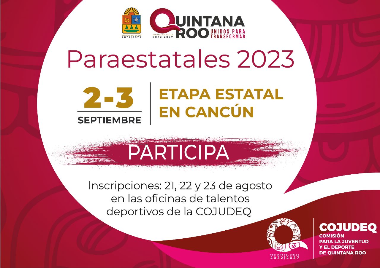Las inscripciones para competir en la fase Paraestatal de la justa, será del 21 al 23 de agosto próximos, en las oficinas de Talentos Deportivos de la COJUDEQ en Chetumal, cumpliendo con los requisitos que solicita la convocatoria, la cual se puede descargar vía internet a través del link: https://qroo.gob.mx/cojudeq/wp-content/cojudeq/uploads/2023/08/convocatoria-paranacionales.pdf