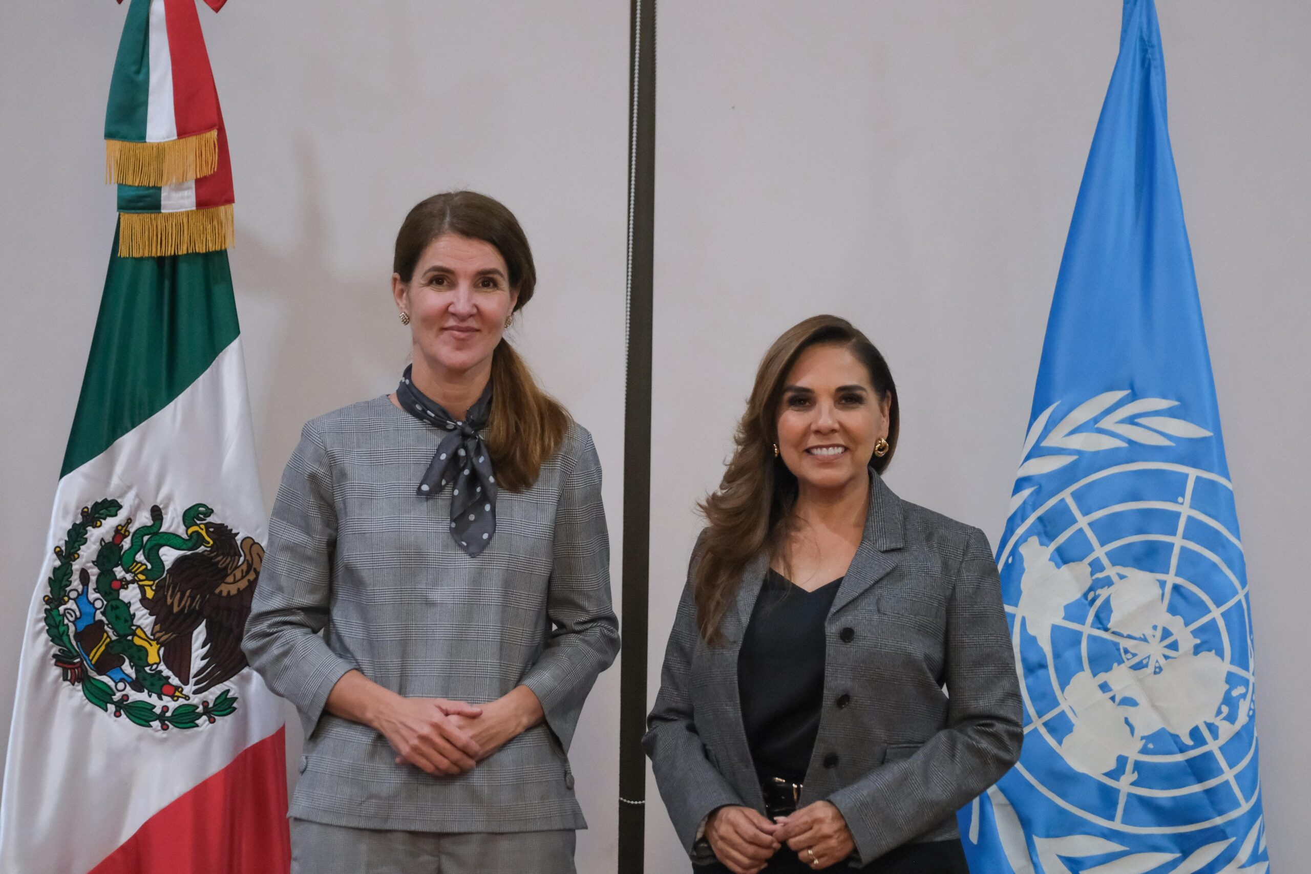 Cancún.- La gobernadora Mara Lezama Espinosa y la Jefa de la Oficina de la ONU-Hábitat para México, Cuba y Centroamérica, Fernanda Lonardoni, encabezaron una reunión de trabajo con parte del gabinete estatal en el que revisaron temas para el bienestar, la justicia social y la prosperidad compartida para las y los quintanarroenses.