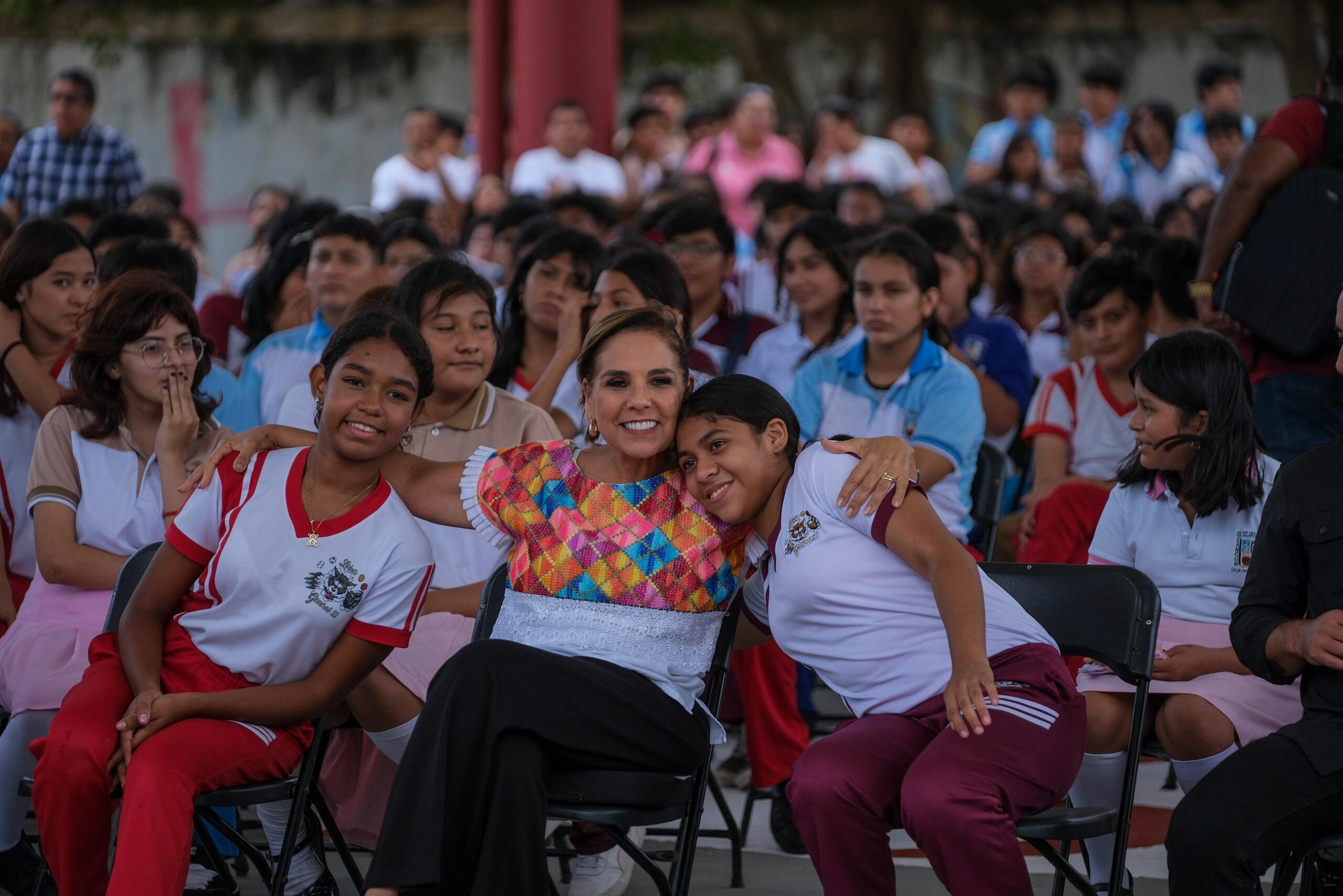 Durante la ceremonia inaugural la gobernadora Mara Lezama estuvo acompañada de los estudiantes Hanna Nicole Córdova, Ashly Juana Castañeda Rodríguez, José Aramis López Solano, David Emmanuel Analco Barrera, Martha Espinosa López, Kevin Daniel Dzul Ordóñez, Zoe Dareny López Sánchez y Alán de Jesús Durán Pérez.