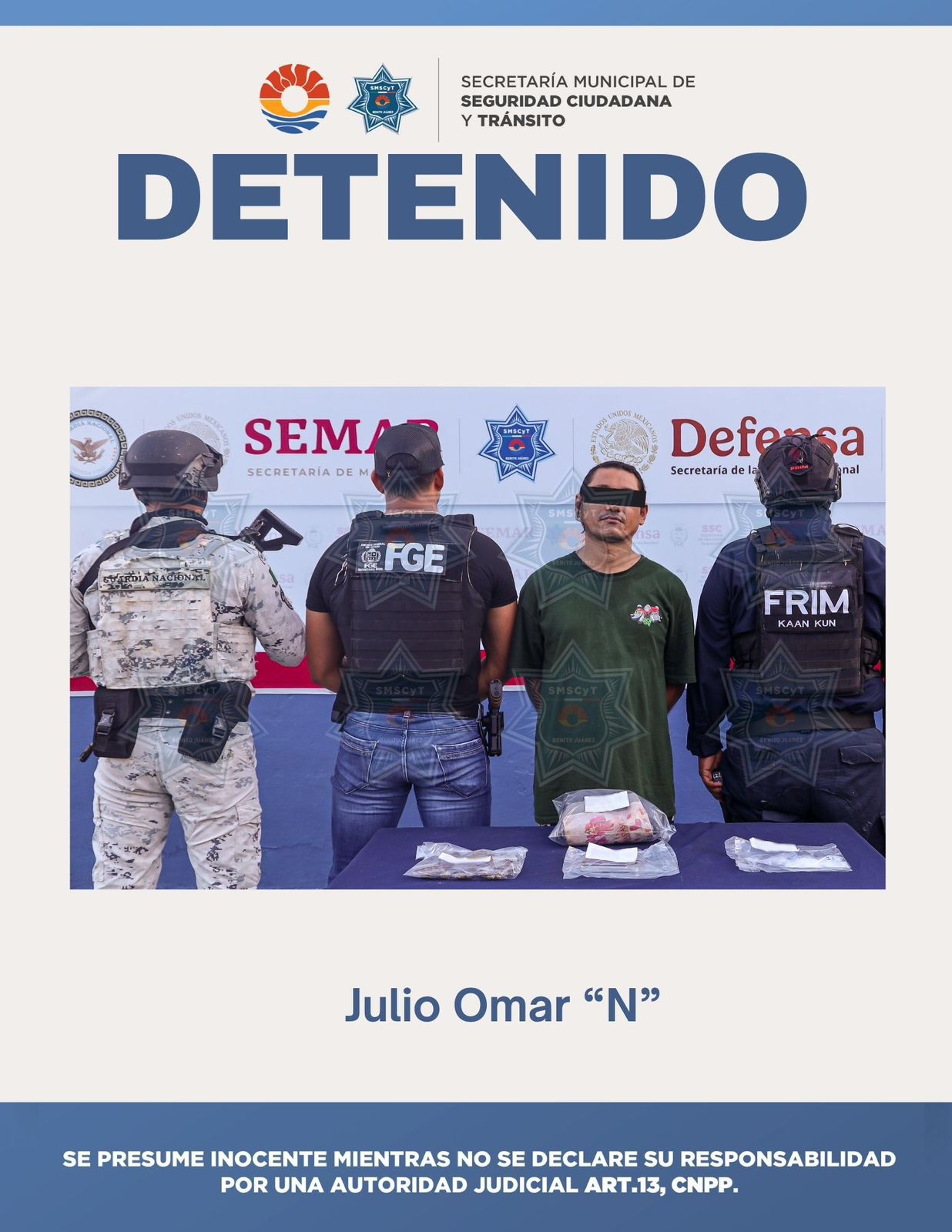 Cancún, Q. Roo., 20 de noviembre de 2025.- Elementos de la Secretaría Municipal de Seguridad Ciudadana y Tránsito (SMSCyT), en una acción coordinada con personal de la Fiscalía General del Estado (FGE) y autoridades federales, detuvieron a un hombre por su presunta participación en delitos contra la salud, en la modalidad de narcomenudeo.