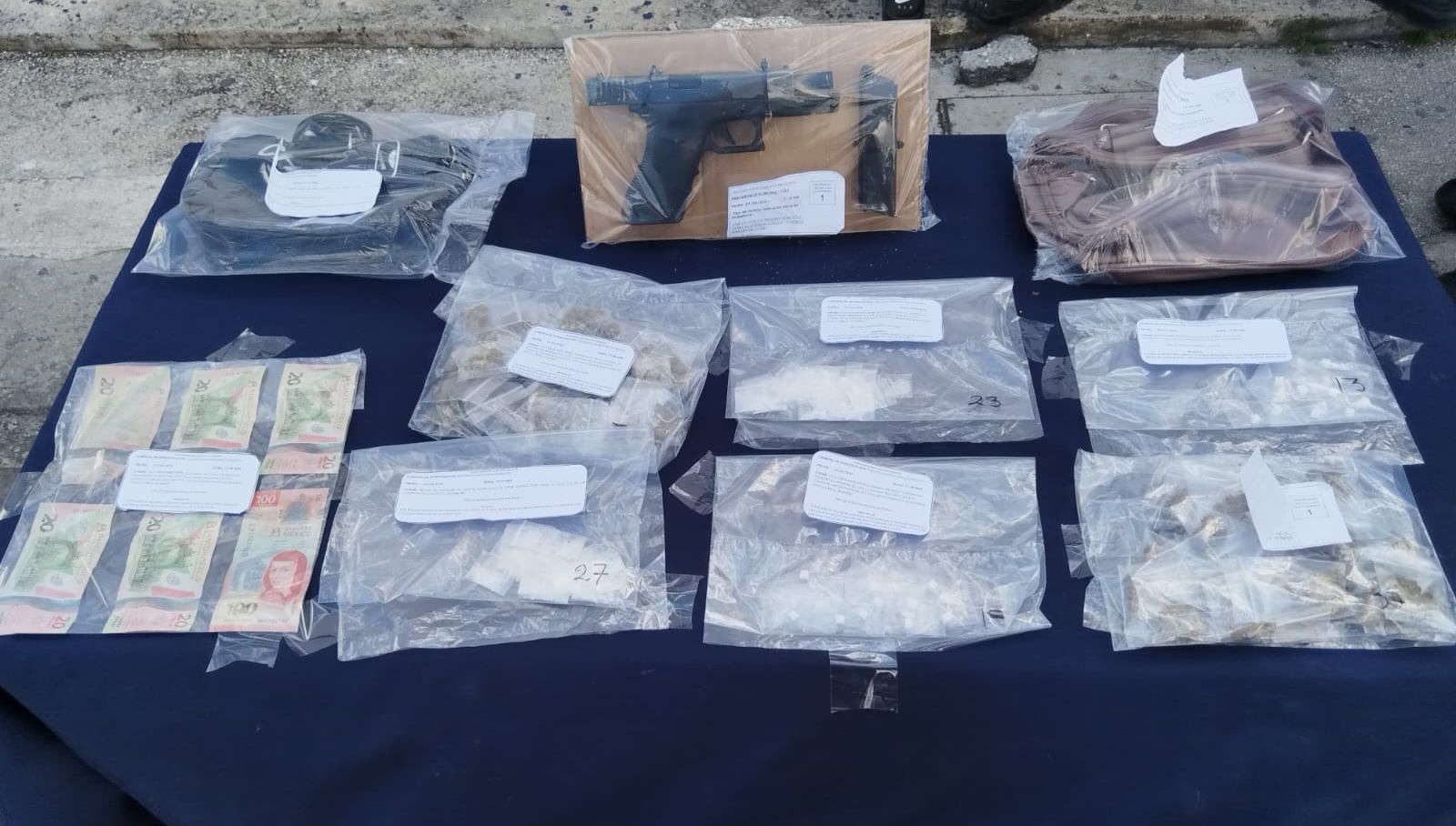 Al intervenir y realizarle una inspección de seguridad, se le aseguraron 72 bolsitas de plástico transparente con hierba seca similar a la marihuana, 27 bolsitas con fragmentos cristalinos con características del alcaloide conocido como cristal y 13 bolsitas con una sustancia sólida similar a la droga conocida como piedra. También se le aseguró un objeto con características similares a un arma de fuego tipo corta, color negro, con cargador.
