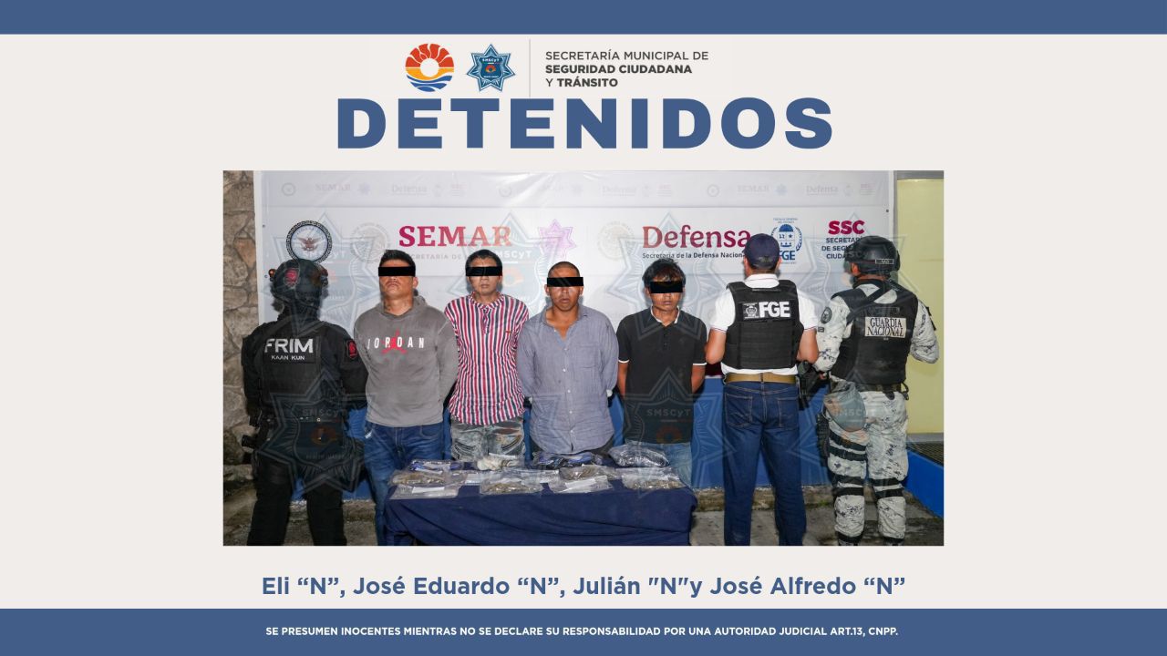 Cancún, Q. Roo., 15 de noviembre 2025.- En una acción coordinada con la Fiscalía General del Estado (FGE), autoridades federales y la Secretaría Municipal de Seguridad Ciudadana y Tránsito (SMSCyT), se logró la detención de cuatro personas del sexo masculino, presuntos implicados en delitos contra la salud, en su modalidad de narcomenudeo.