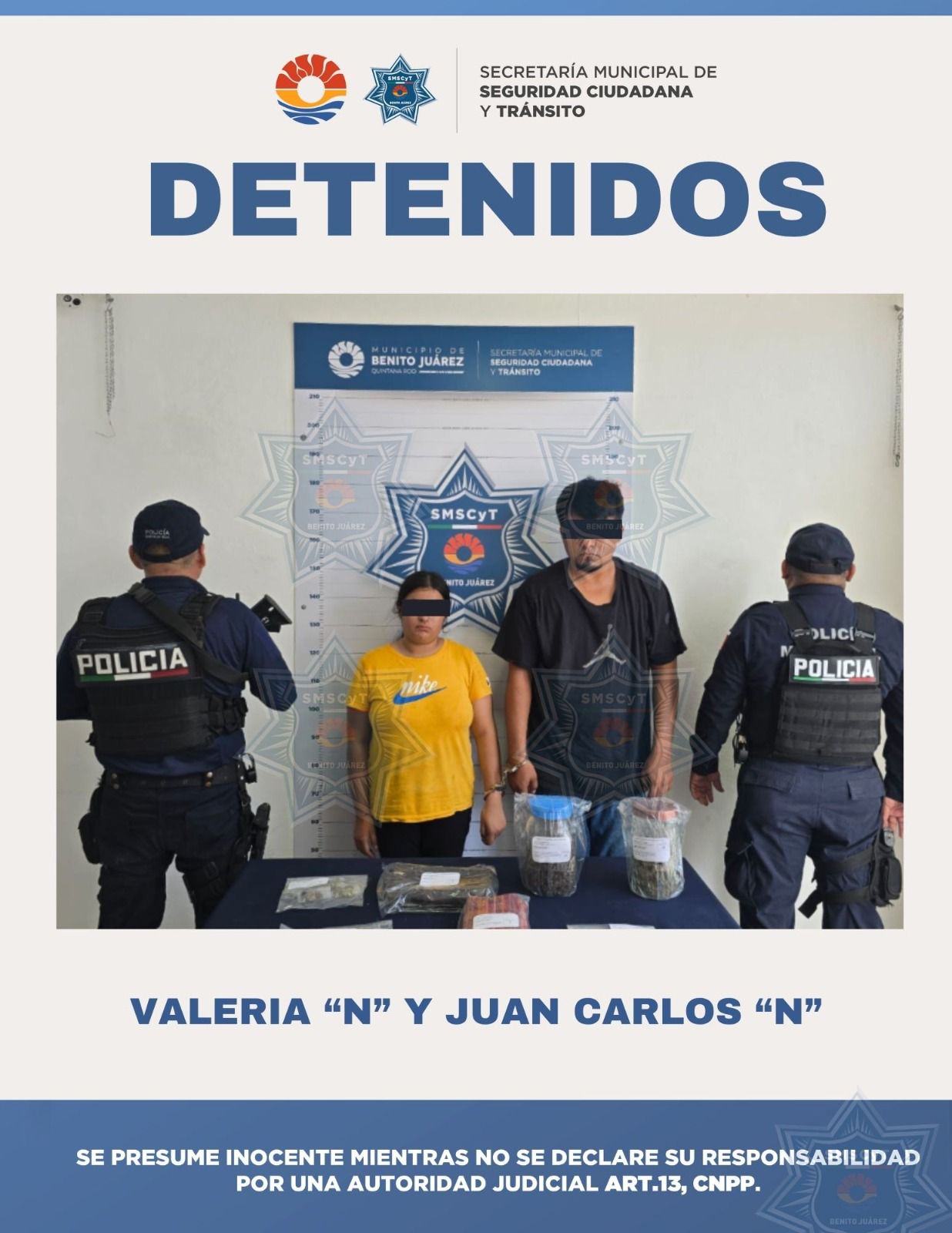 Cancún, Q. Roo, a 2 de agosto de 2025.– Elementos de la Secretaría Municipal de Seguridad Ciudadana y Tránsito (SMSCyT) de Benito Juárez detuvieron a dos personas presuntamente implicadas en delitos contra la salud, en su modalidad de narcomenudeo.