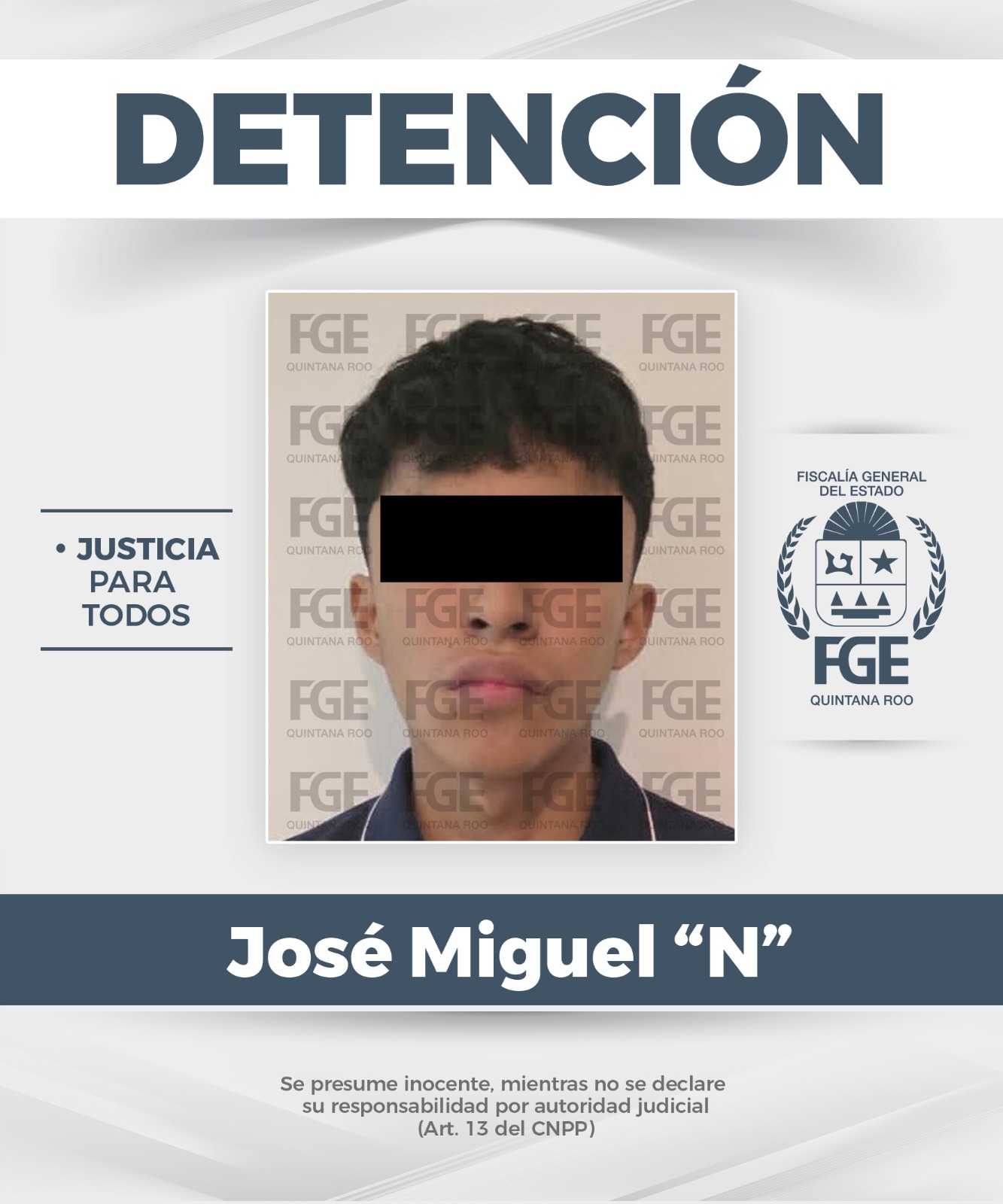 Benito Juárez.– La Fiscalía General del Estado informa que elementos de la Policía de Investigación lograron la detención de José Miguel “N”, por su probable participación en hechos posiblemente constitutivos del delito de robo de motocicleta.
