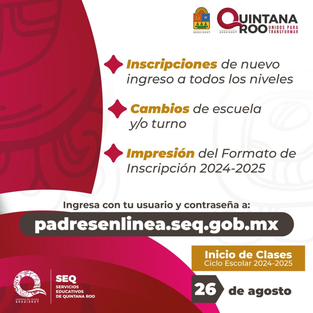 Chetumal.- El próximo 13 de agosto de 2024, a través de la plataforma https://padresenlinea.seq.gob.mx/ se abre el último periodo de inscripciones de nuevo ingreso para preescolar, primaria y secundaria y cambios de escuela o turno para el ciclo escolar 2024-2025.