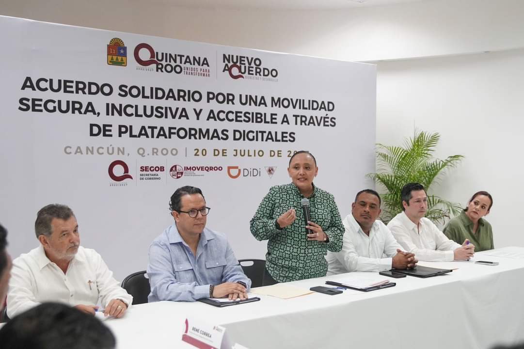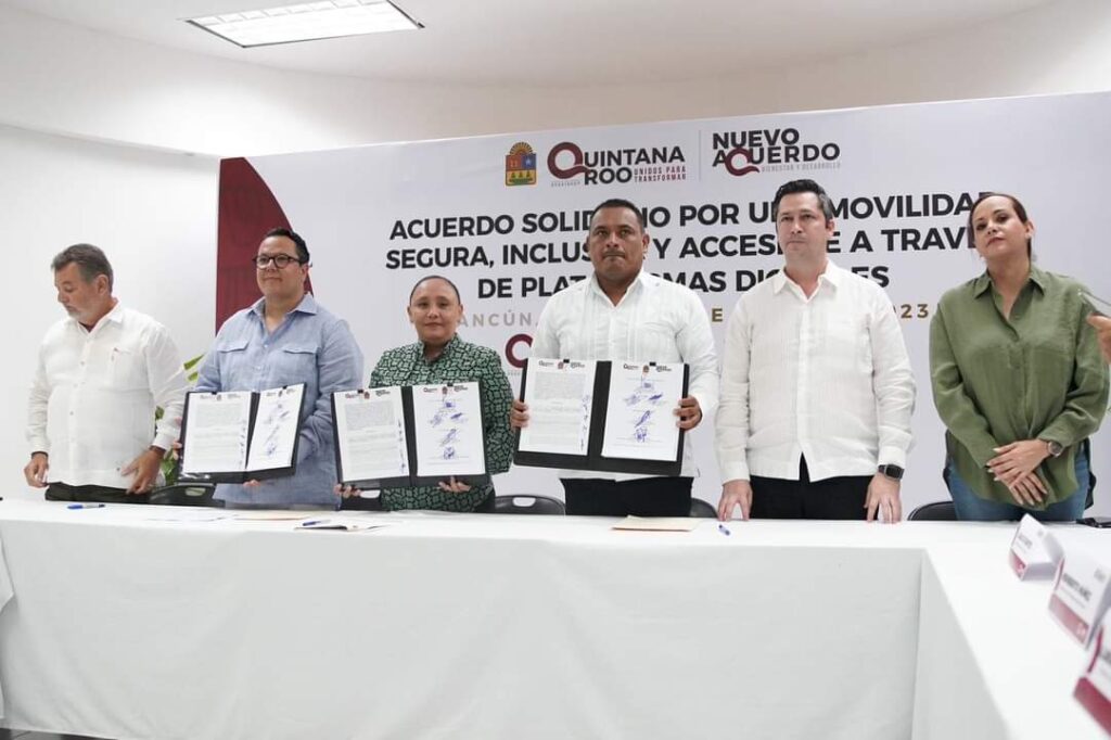 Cancún.- Derivado de las reformas a la Ley de Movilidad, y para que la gente tenga mayores oportunidades para trasladarse en condiciones de seguridad, eficiencia, calidad e inclusión, el gobierno de Quintana Roo, a través de la secretaria de Gobierno Cristina Torres Gómez atestiguó la firma de un acuerdo solidario entre el Frente Único de Trabajadores del Volante (FUTV) y la plataforma digital DiDi México.