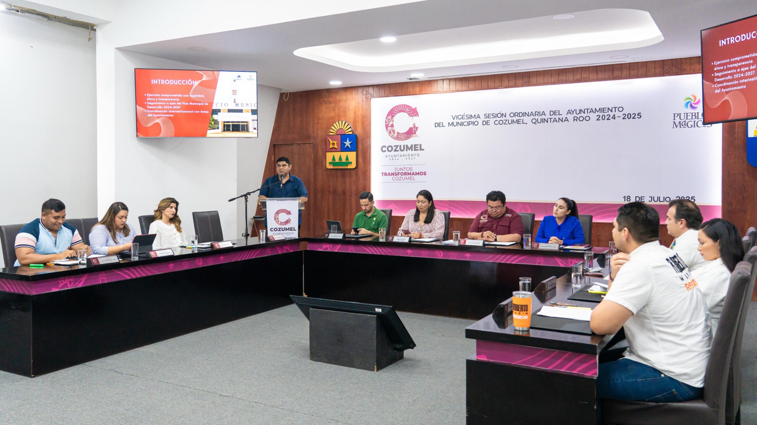 Cozumel, a 18 de julio de 2025.- En un ejercicio de transparencia, legalidad y participación, se llevó a cabo la vigésima sesión ordinaria de Cabildo, encabezada por el Presidente Municipal, José Luis Chacón Méndez, en la que el titular del órgano interno de control del Ayuntamiento presentó el informe semestral y se aprobó por mayoría la baja del activo fijo de los estados financieros del bien denominado “Parque del Sol”.