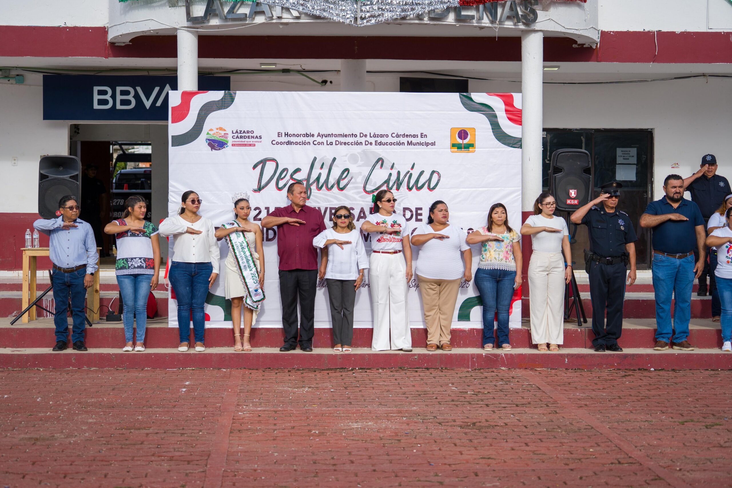 Kantunilkín. 16 de septiembre del 2025.-El presidente municipal Nivardo Mena encabezó el acto cívico para conmemorar el 215 aniversario de la Independencia ante la presencia de cientos de alumnos y maestros que, previamente participaron en el desfile alusivo a este día.