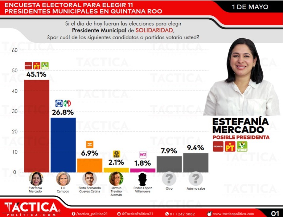 En la pregunta ¿Si el día de hoy fueran las elecciones para elegir presidente municipal de Solidaridad, por cuál candidatos o partidos votaría Usted?, el 45.1% de los solidarenses encuestados por Táctica Política dijo que lo haría por Estefanía Mercado y el 26.8% en favor de Lili Campos, quien busca la reelección.