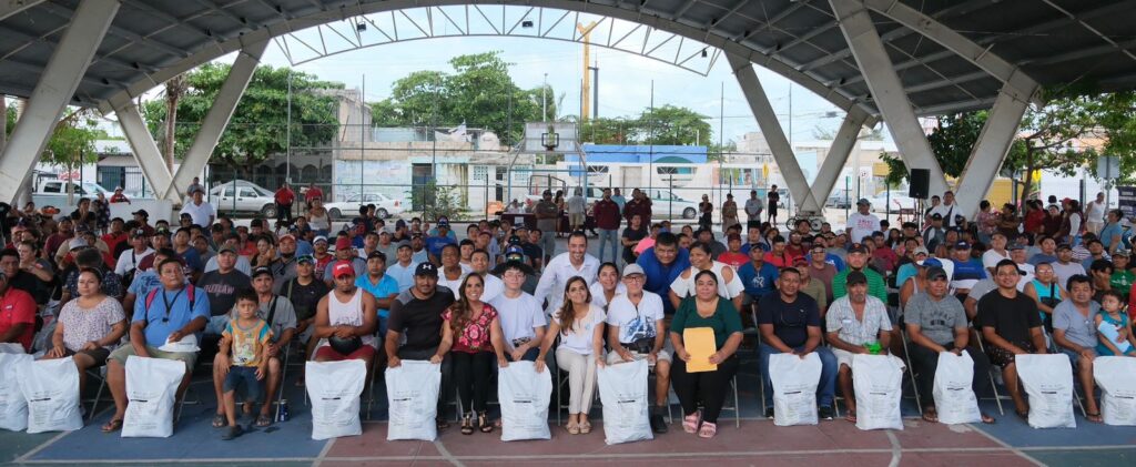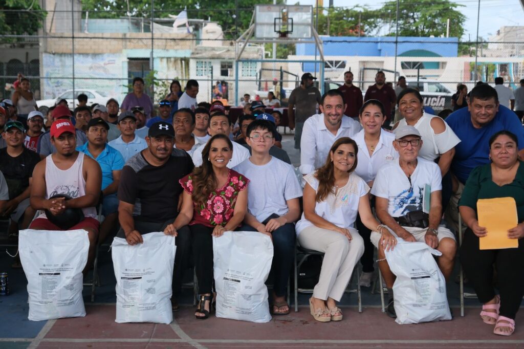 Cancún.- Trabajadores del sector pesquero independiente de Benito Juárez que se vieron afectados por las lluvias torrenciales, recibieron de la gobernadora Mara Lezama Espinosa apoyos alimentarios durante un evento realizado en el parque urbano de Puerto Juárez en Cancún.