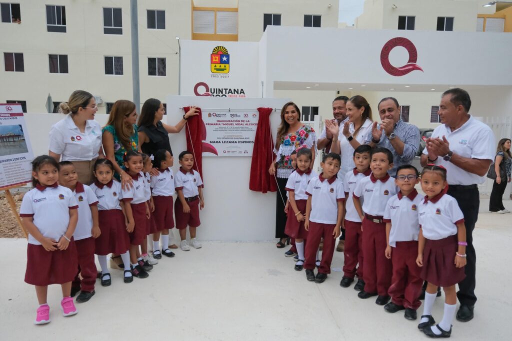 Cancún.- Con inversión de 17.8 millones de pesos, la gobernadora Mara Lezama Espinosa inauguró el edificio de la escuela primaria de nueva creación “Miguel Vidal Alcocer”, del fraccionamiento Cielo Nuevo, evento en el que también inició la construcción de un domo ligero para complementar instalaciones.