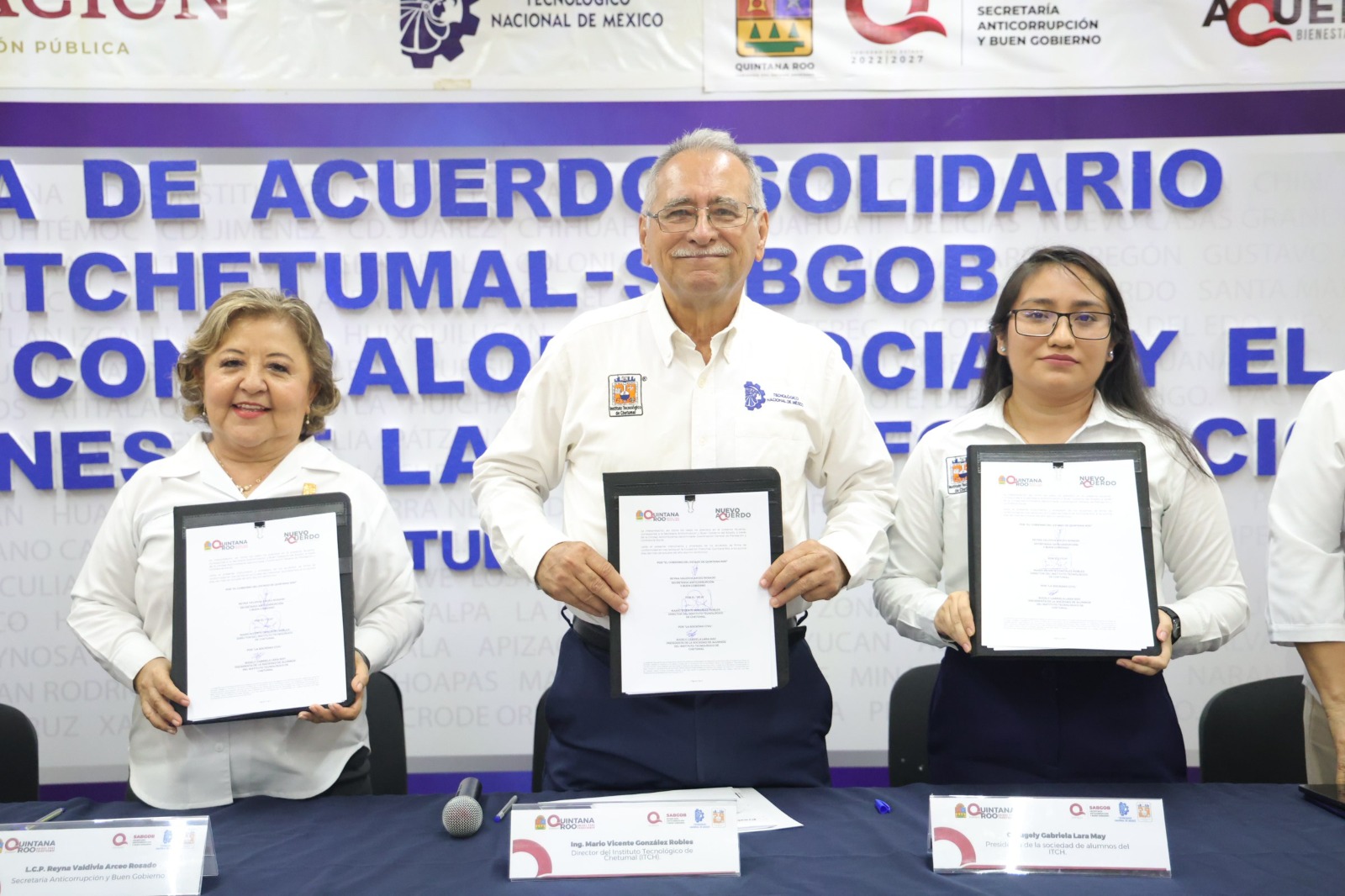 Chetumal.– En el marco del Nuevo Acuerdo por el Bienestar y Desarrollo de Quintana Roo, que impulsa la gobernadora Mara Lezama Espinosa, la Secretaría Anticorrupción y Buen Gobierno y el Instituto Tecnológico de Chetumal firmaron un Acuerdo Solidario para fortalecer la cultura de la transparencia, la rendición de cuentas y la participación ciudadana.