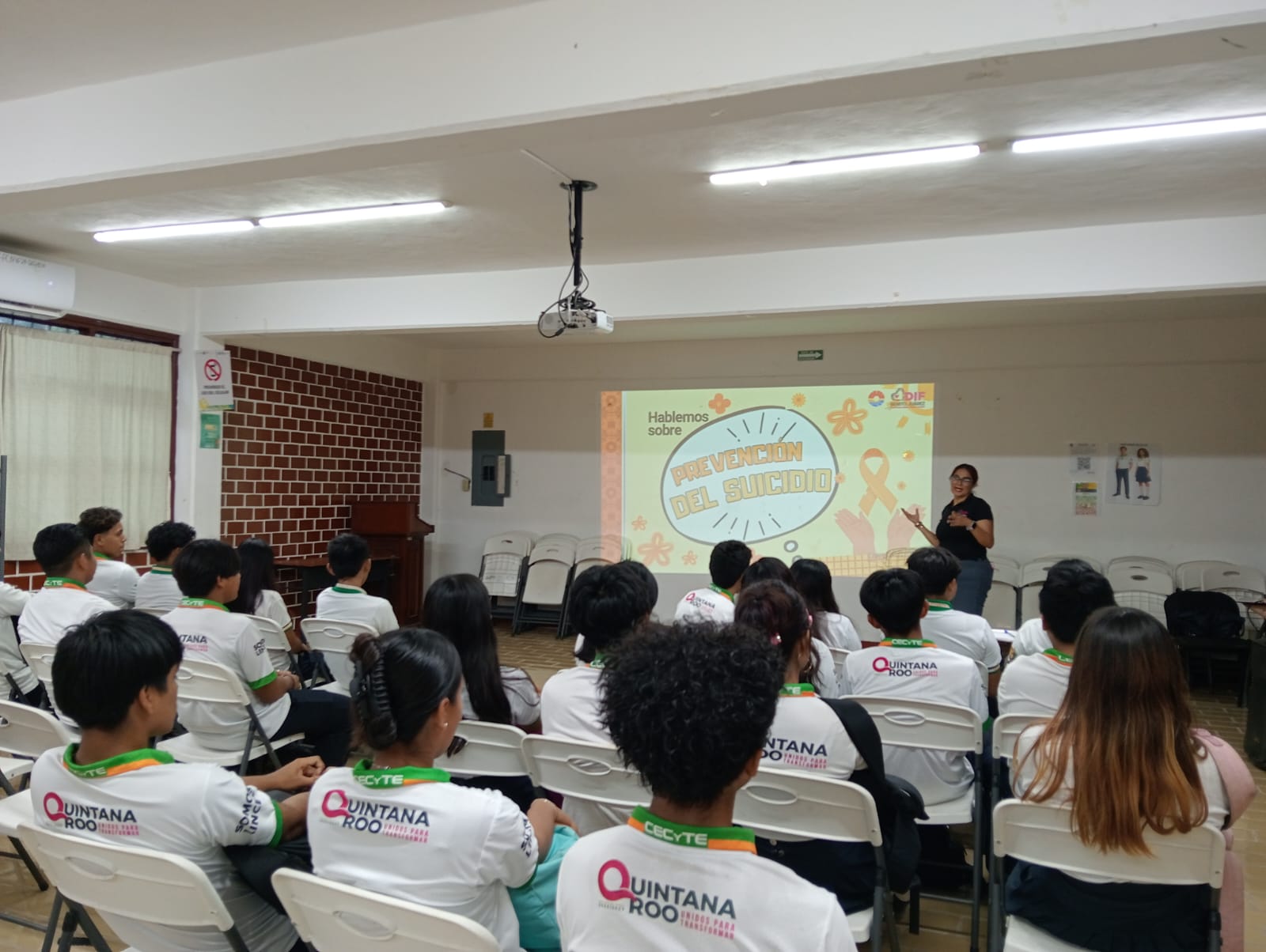 Cancún, Q. R., a 15 de septiembre de 2025.- El Sistema para el Desarrollo Integral de la Familia (DIF) Benito Juárez, a través de la dirección de Prevención de Riesgos Psicosociales de Niñas, Niños y Adolescentes (DIPRINNA), impartió pláticas de prevención del suicidio a alumnas y alumnos del Colegio de Estudios Científicos y Tecnológicos (CECyTE) plantel III, en el marco del Día Mundial para la Prevención del Suicidio.