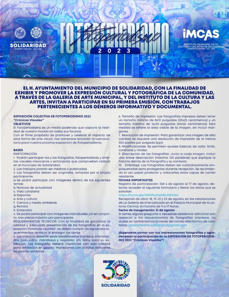 Playa del Carmen, Solidaridad, 11 de agosto del 2023.- El gobierno municipal dirigido por Lili Campos invita, a través del Instituto Municipal de la Cultura y las Artes, a participar en la “Exposición Colectiva de Fotoperiodismo” cuya convocatoria estará abierta hasta el 17 de agosto. Se exhibirá y promoverá la expresión cultural y fotográfica de la comunidad, la que será inaugurada el 31 de agosto en la Galería de Arte.