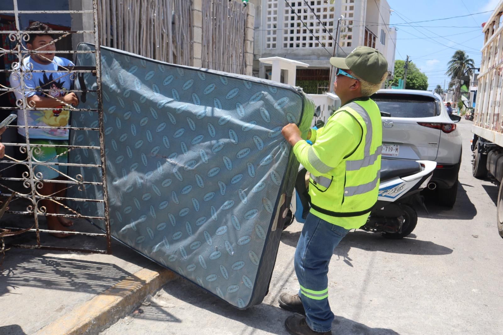 En la Isla, las brigadas de limpieza recorrieron las colonias Electricistas y La Caribeña, recolectando cacharros, objetos inservibles y residuos voluminosos acumulados en patios y azoteas.
