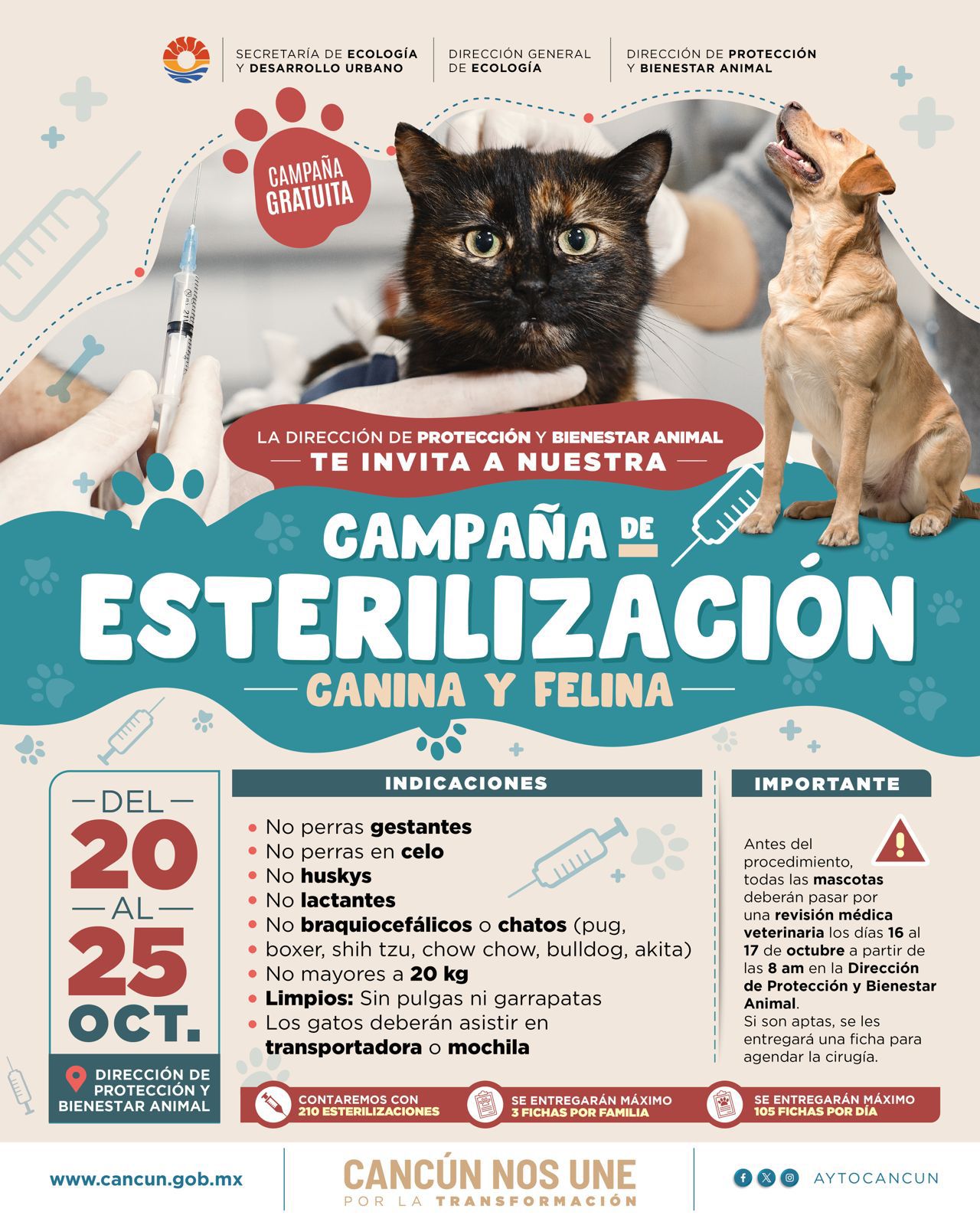 Cancún, Q. R., a 19 de octubre de 2025.- Con el firme compromiso de cuidar, prevenir y garantizar el bienestar de las mascotas, la Presidenta Municipal, Ana Paty Peralta, a través de la Dirección General de Protección y Bienestar Animal, invita a las y los cancunenses a aprovechar la Campaña Gratuita de Esterilización Canina y Felina, que se llevará a cabo del 20 al 25 de octubre en las instalaciones de la mencionada dependencia.