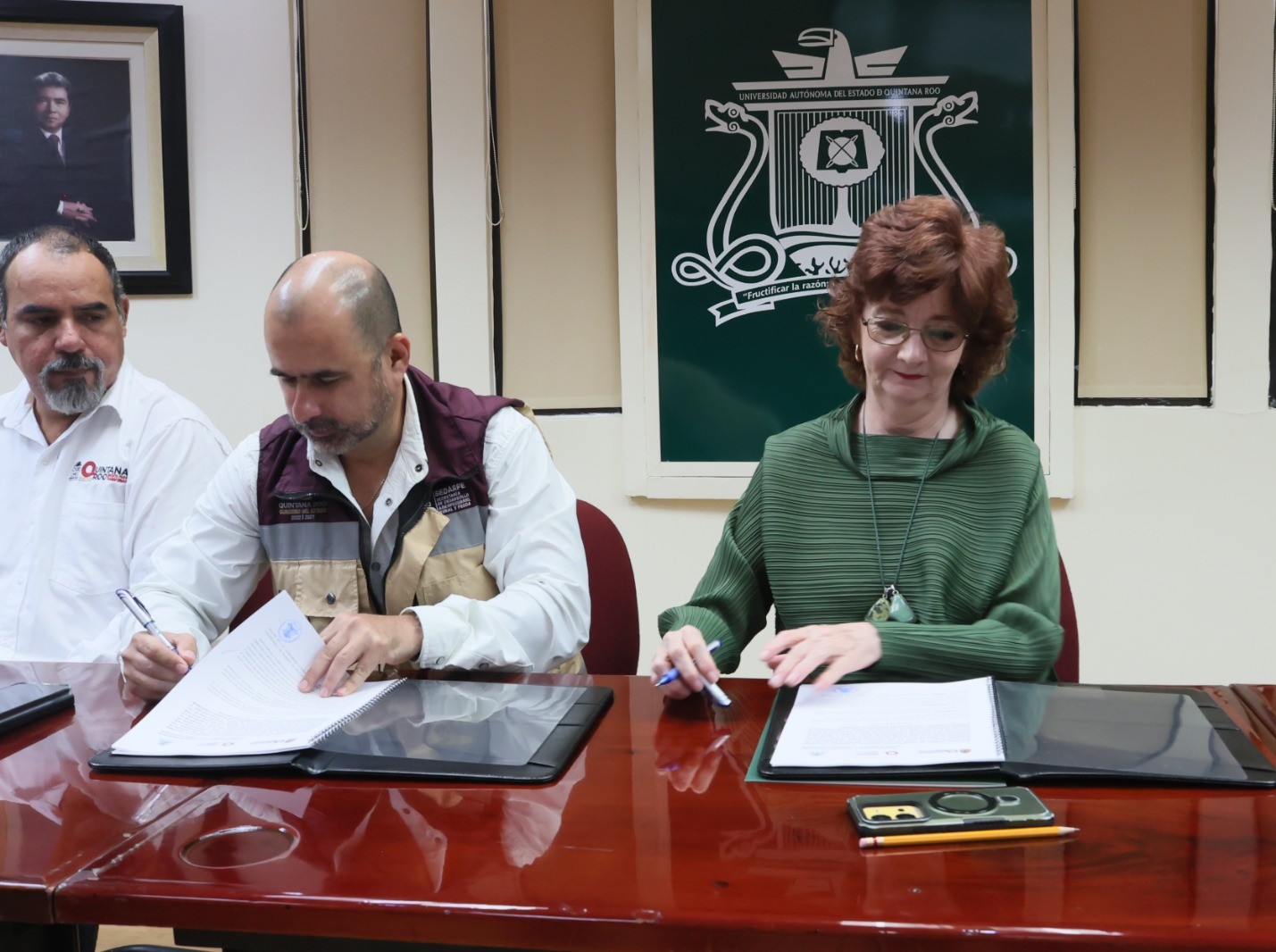 La firma del convenio estuvo a cargo del titular de la SEDARPE, Jorge Aguilar Osorio, y de la rectora de la UQROO, Dra. Consuelo Natalia Fiorentini Cañedo, quienes coincidieron en la importancia de sumar esfuerzos para generar prosperidad compartida y oportunidades para las nuevas generaciones.