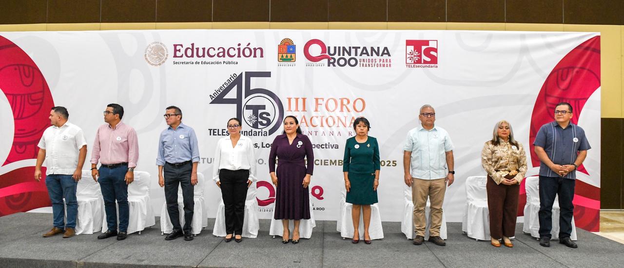 En su mensaje en el Centro Internacional de Negocios y Convenciones, la titular de la Secretaría de Educación de Quintana Roo (SEQ), mencionó que: “Hoy nos reúne un propósito profundo: mirar con orgullo lo que hemos construido y con esperanza lo que estamos por transformar juntos; a lo largo de estos 45 años, la Telesecundaria ha sido más que una modalidad, ha sido una puerta abierta al conocimiento, un puente de oportunidades y, sobre todo, un gesto de justicia educativa para quienes más lo necesitan”.