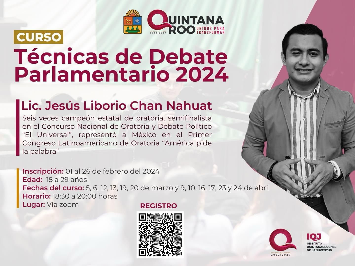 Chetumal.- Con el objetivo de fortalecer las competencias comunicativas de las y los jóvenes, así como promover temas de interés colectivo y desarrollar habilidades de interlocución, el Instituto Quintanarroense de la Juventud (IQJ) que encabeza Alma Alvarado Moo, dio a conocer que en los meses de abril y mayo se llevará a cabo el “Curso de Debate Parlamentario 2024”.