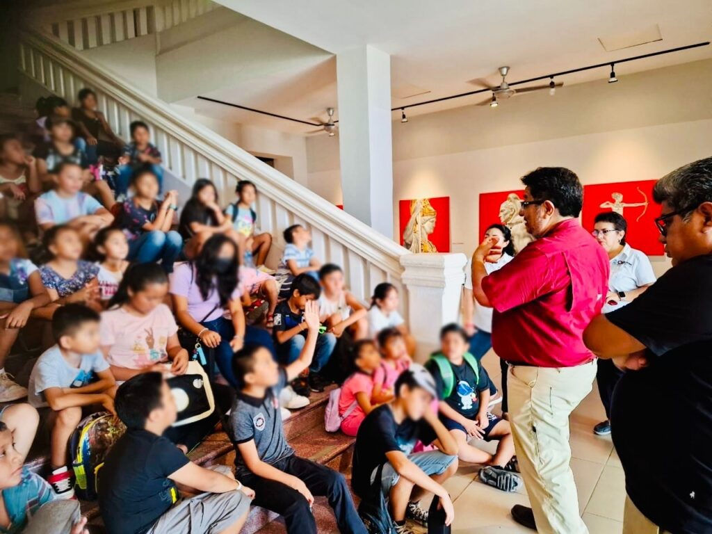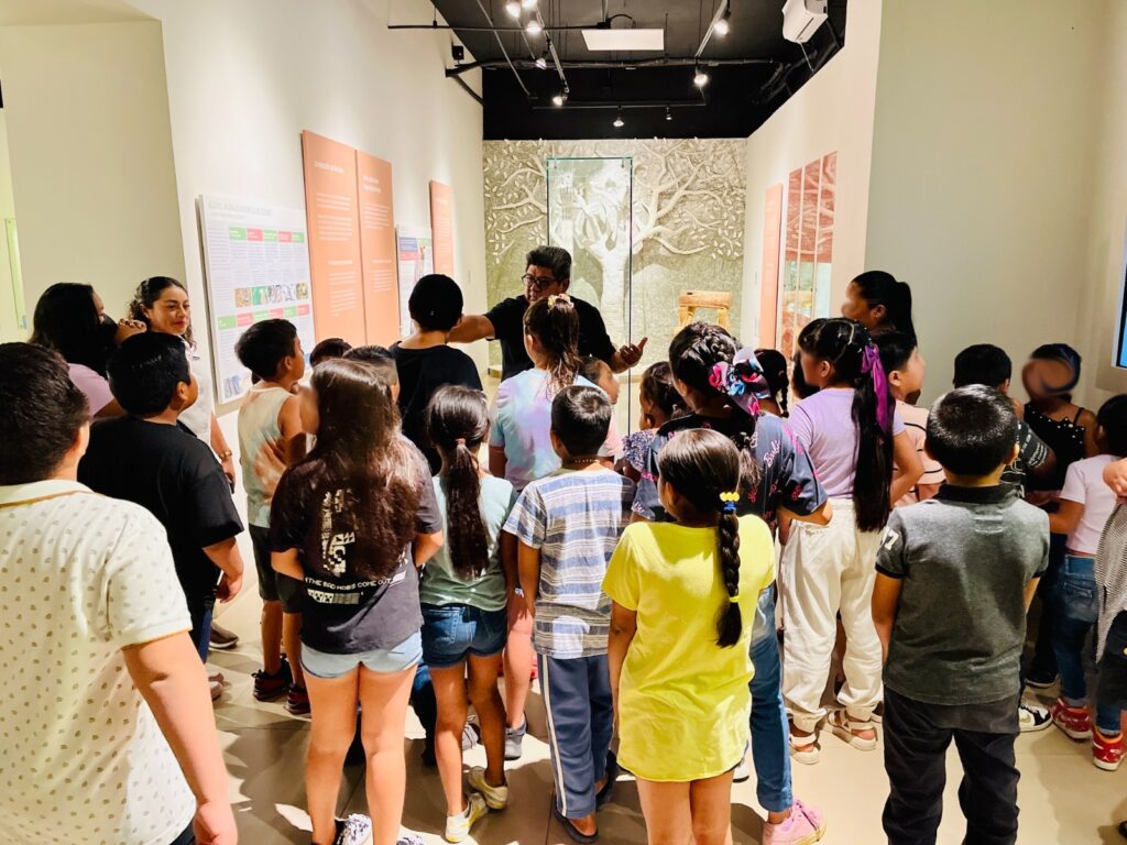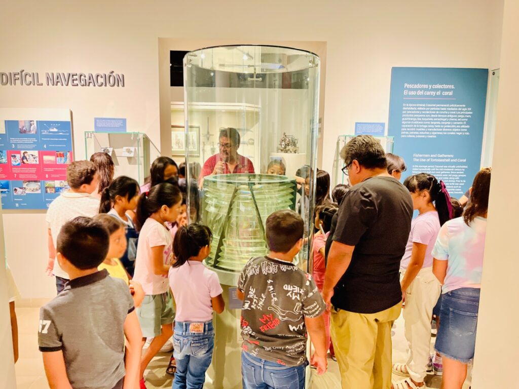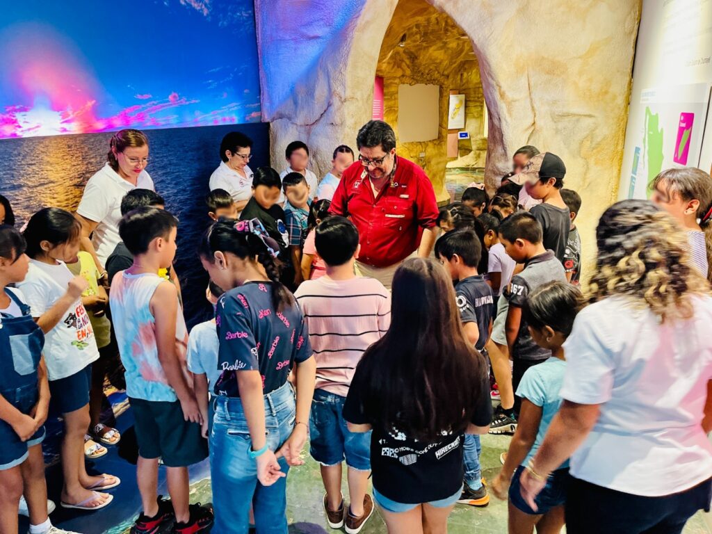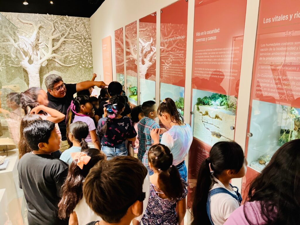 Las y los pequeños disfrutaron de un recorrido guiado por las 11 salas del recinto, con el apoyo de Jesús Benavides Andrade y Héctor González Cortés, director y subdirector del parque Ecoturístico Punta Sur, respectivamente, quienes ofrecieron una visión integral del contexto geológico, la relevancia ecosistémica y de la biodiversidad insular, así como de la rica historia y cultura de Cozumel, de una forma amena y divertida para los infantes.