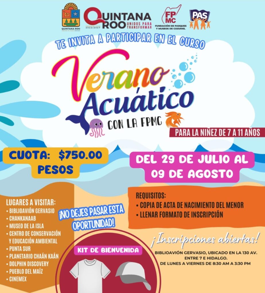 Cabe señalar que el cupo es limitado y la cuota de inscripción es de 750 pesos por participante. Durante el curso, las y los niños podrán disfrutar de una variedad de actividades y visitas a lugares emblemáticos de Cozumel como: el Parque Natural Chankanaab, el Parque Ecoturístico Punta Sur, el BiblioAvión Gervasio, el Museo de la Isla, el Centro de Conservación y Educación Ambiental, el Planetario Cha’an Ka’an, el delfinario Dolphin Discovery, el Pueblo del Maíz y Cinemex.