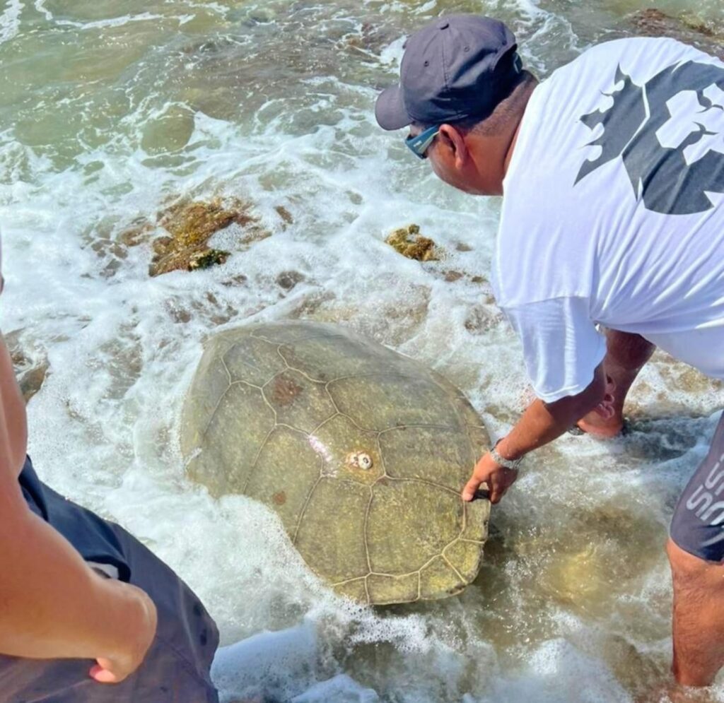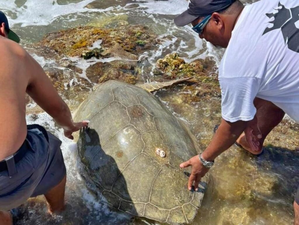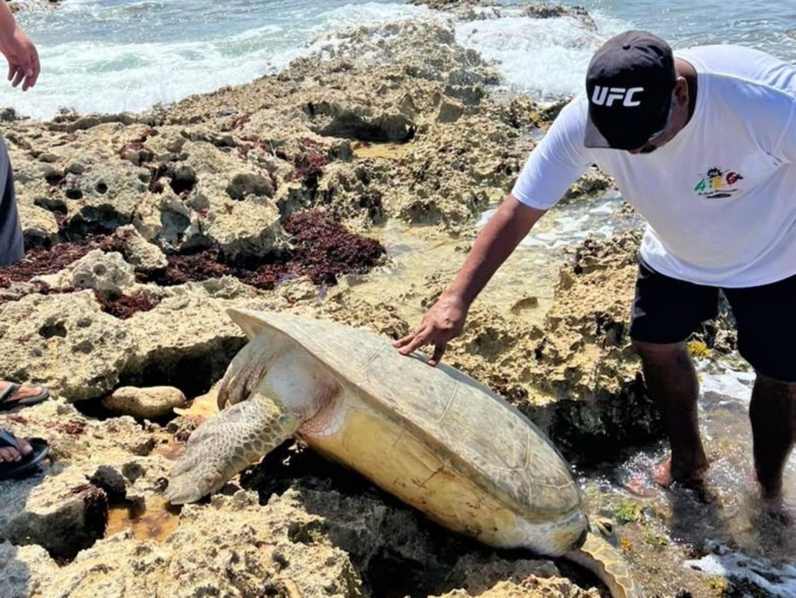 Cozumel.- El personal de la Fundación de Parques y Museos de Cozumel (FPMC), con el apoyo de la comunidad, en particular del restaurante Rastas, llevaron a cabo el exitoso rescate y posterior liberación de una tortuga marina de la especie blanca (Chelonia mydas) que quedó varada en una zona rocosa del Parque Ecoturístico Punta Sur.