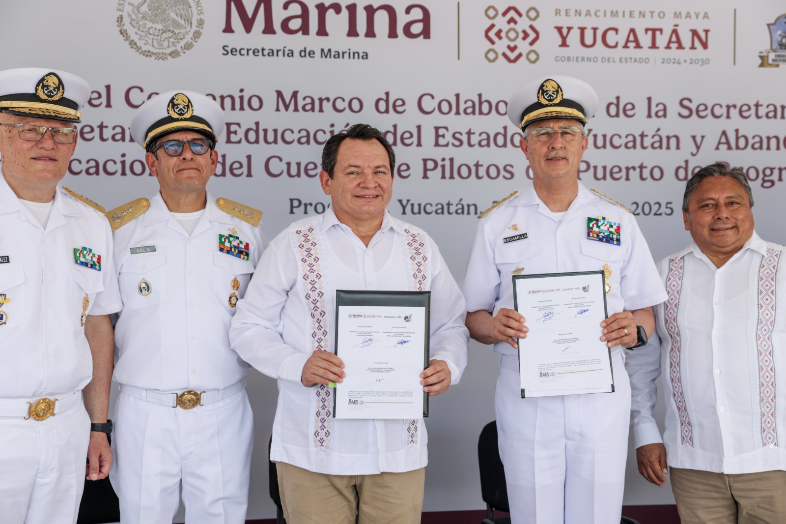 Acompañado del Almirante Francisco Guillermo Escamilla Cázares, Oficial Mayor de la Secretaría de Marina, el Gobernador firmó como testigo de honor este convenio, el cual permitirá a más jóvenes yucatecos formarse en disciplinas vinculadas con el mar, con el comercio naval, con la ingeniería marítima, con la seguridad y defensa nacional.