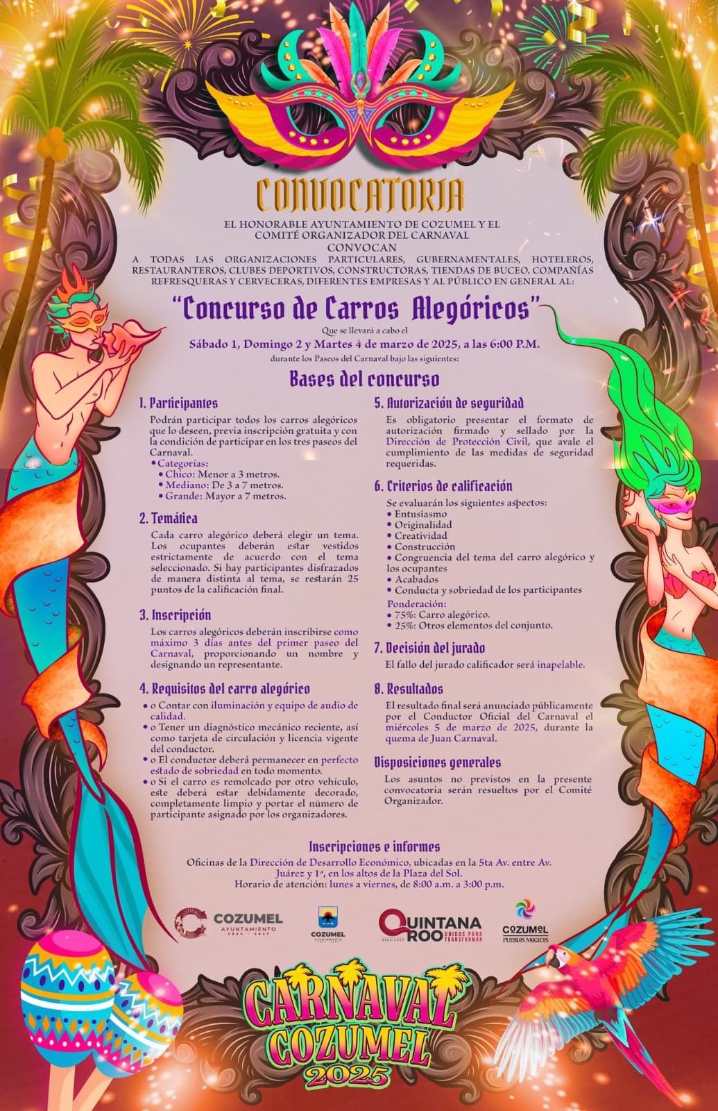 Cozumel, jueves 06 de febrero del 2025. – En visperas de la máxima fiesta de la isla de las golondrinas, el Carnaval Cozumel 2025, el Gobierno Municipal en coordinación con el Comité Organizador, convoca a la comunidad para participar en el “Concurso de Carros Alegóricos”, sumandose a la celebración carnestolenda que se tendrá durante los tres días de paseos, sábado 1, domingo 2 y martes 4 de marzo, sobre la avenida Rafael E. Melgar.