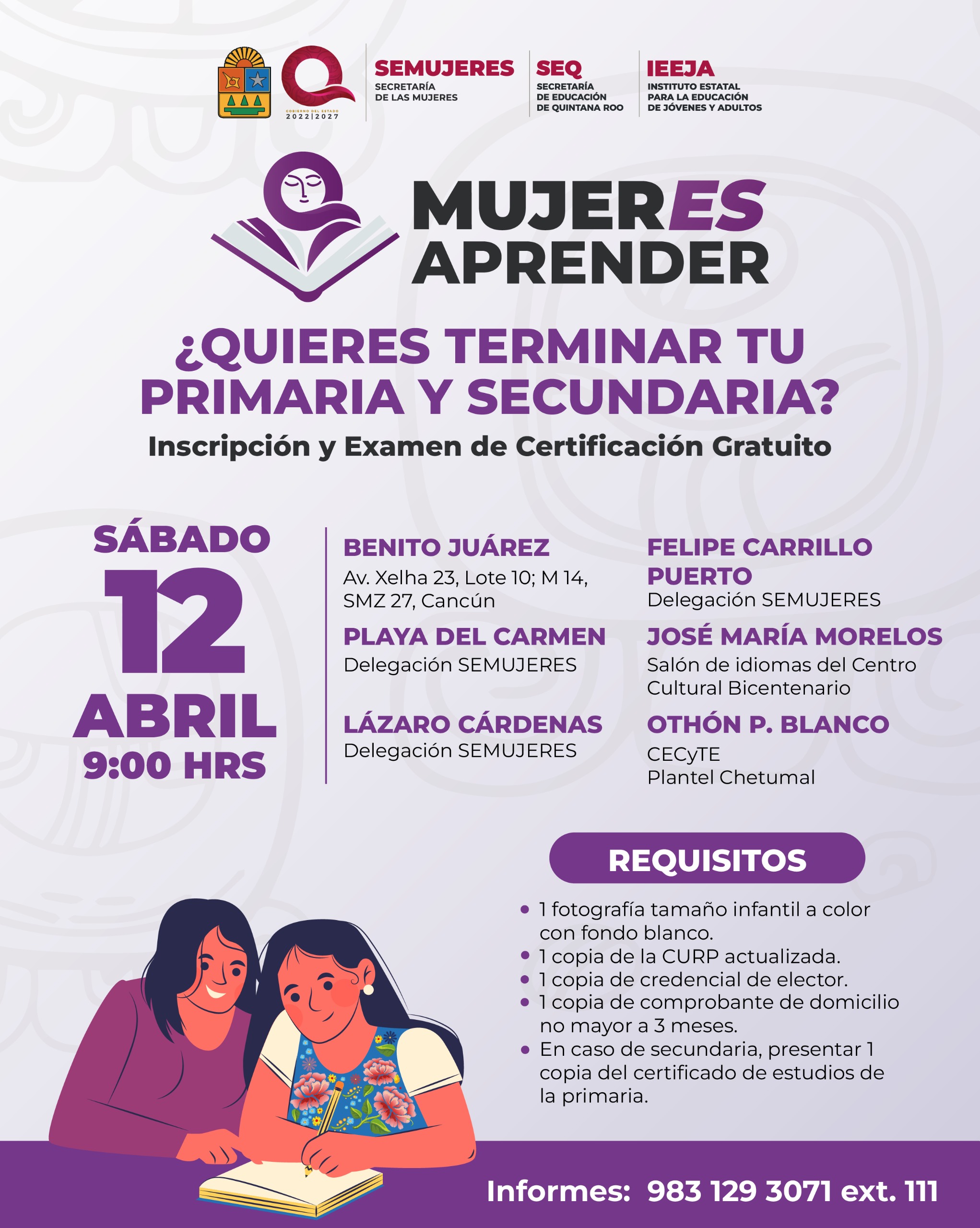 Chetumal.- La Secretaría de las Mujeres (SEMUJERES) que encabeza Esther Burgos Jiménez, en coordinación con la Secretaría de Educación de Quintana Roo (SEQ) y el Instituto Estatal para la Educación de Jóvenes y Adultos (IEEJA), invita a las mujeres mayores de 15 años a participar en la jornada de certificación de educación básica mediante el programa “Mujer es Aprender”, que se realizará este sábado 12 de abril de 09:00 a 13:00 horas, en seis municipios del estado, de manera simultánea.