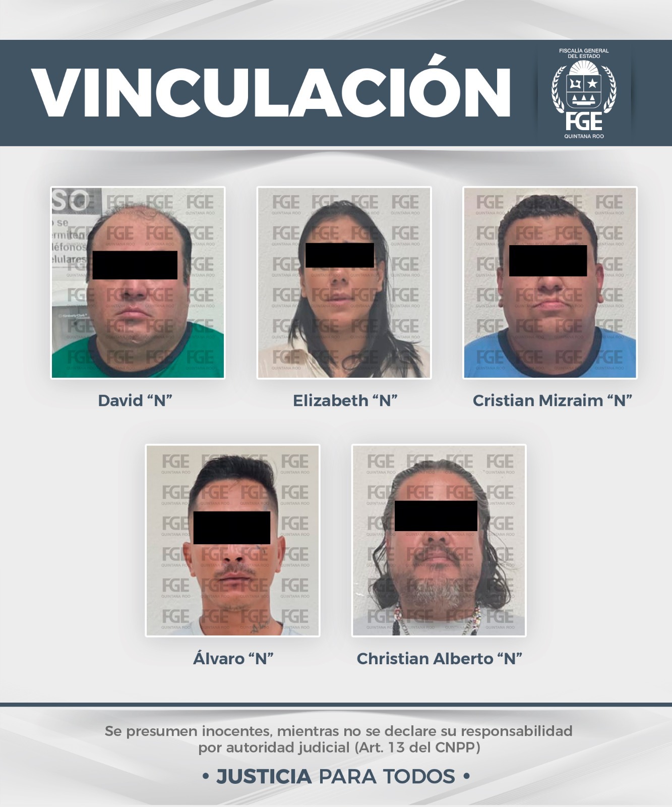 En el municipio de Playa del Carmen, derivado de casos judicializados por hechos ocurridos en Puerto Morelos, se obtuvo la vinculación a proceso de David “N” por su probable participación en hechos posiblemente constitutivos del delito de suministro; mientras que Cristian Mizraim “N” y Elizabeth “N” fueron vinculados por la posesión de cannabis, cocaína y metanfetamina.