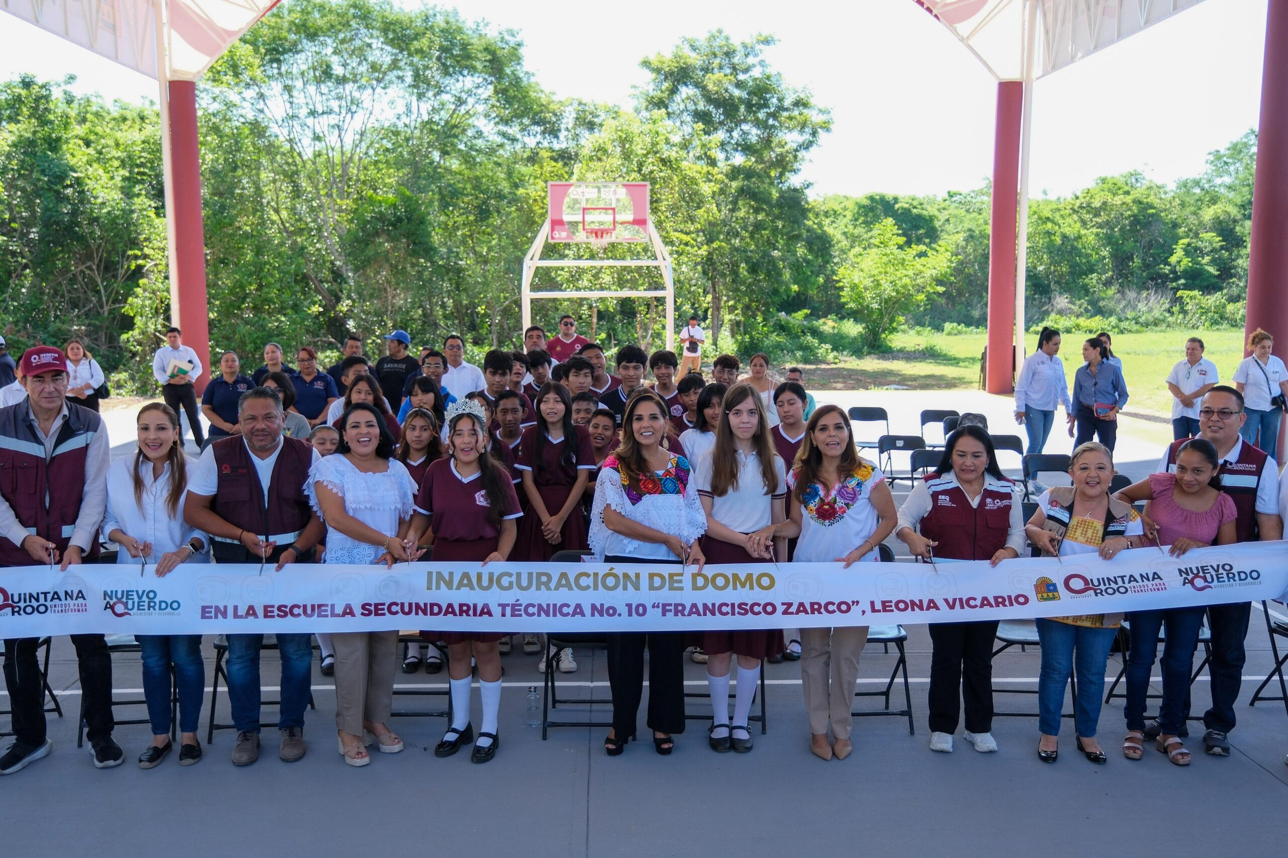 La Gobernadora, acompañada por la presidenta honoraria del Sistema DIF Quintana Roo, Verónica Lezama Espinosa; la presidenta municipal de Puerto Morelos, Blanca Merari Tziu Muñoz; las secretarias de Anticorrupción y Buen Gobierno y de Educación, Reyna Arceo Rosado y Elda Xix Euán, respectivamente, así como el titular de la Secretaría de Obras Públicas, Rafael Lara Díaz, cortaron el listón inaugural del nuevo domo escolar.