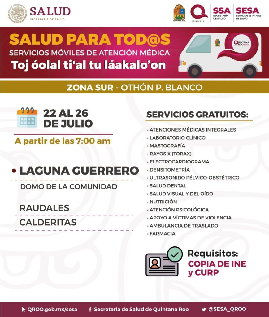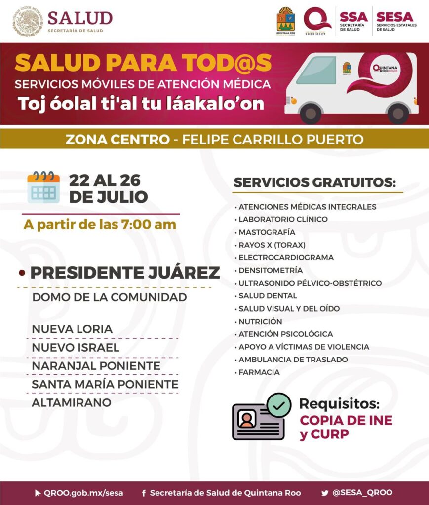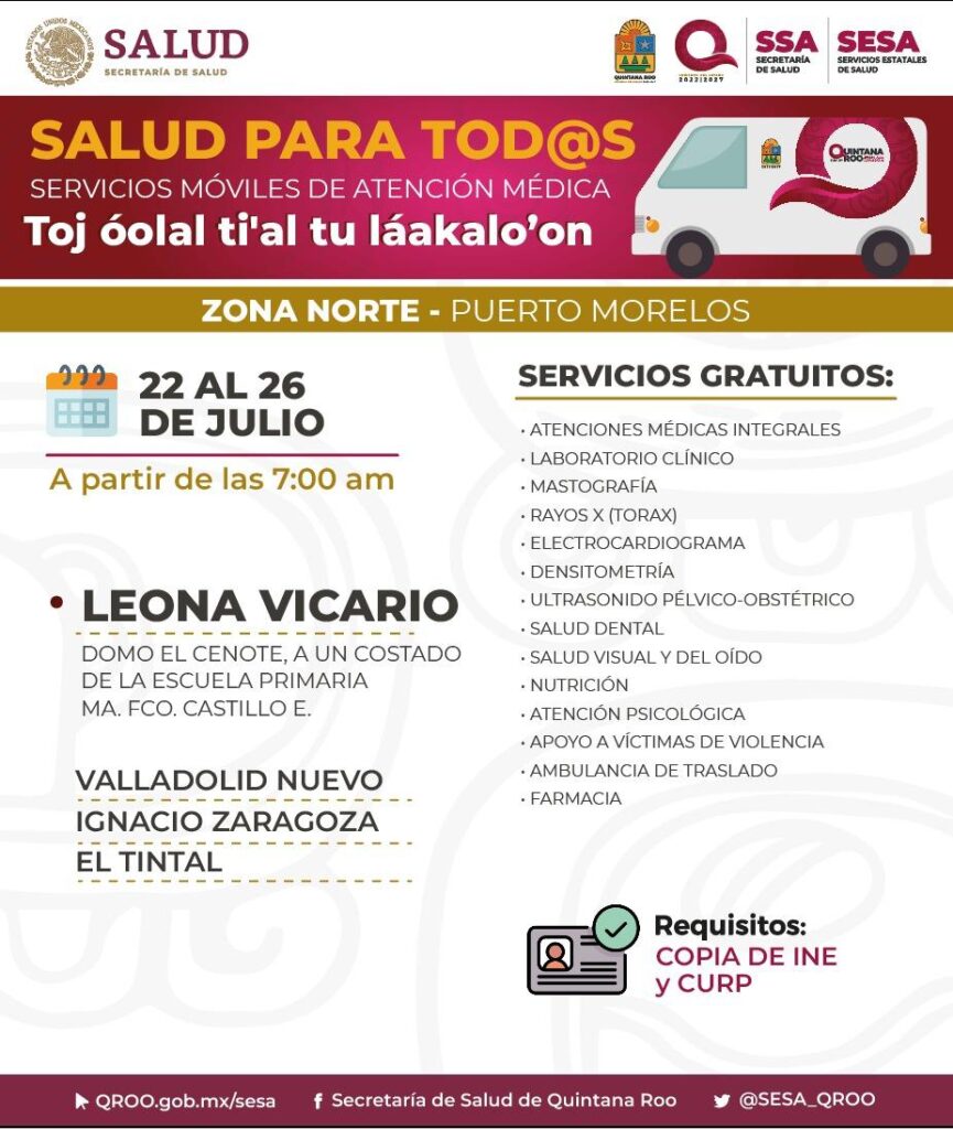 Con el objetivo de atender necesidades en materia de salud las caravanas médicas móviles brindan sus servicios totalmente gratuitos. Del 22 al 26 de julio de instalarán en Leona Vicario, municipio de Puerto Morelos; Laguna Guerrero, del municipio de Othón P. Blanco y Presidente Juárez, de Felipe Carrillo Puerto.