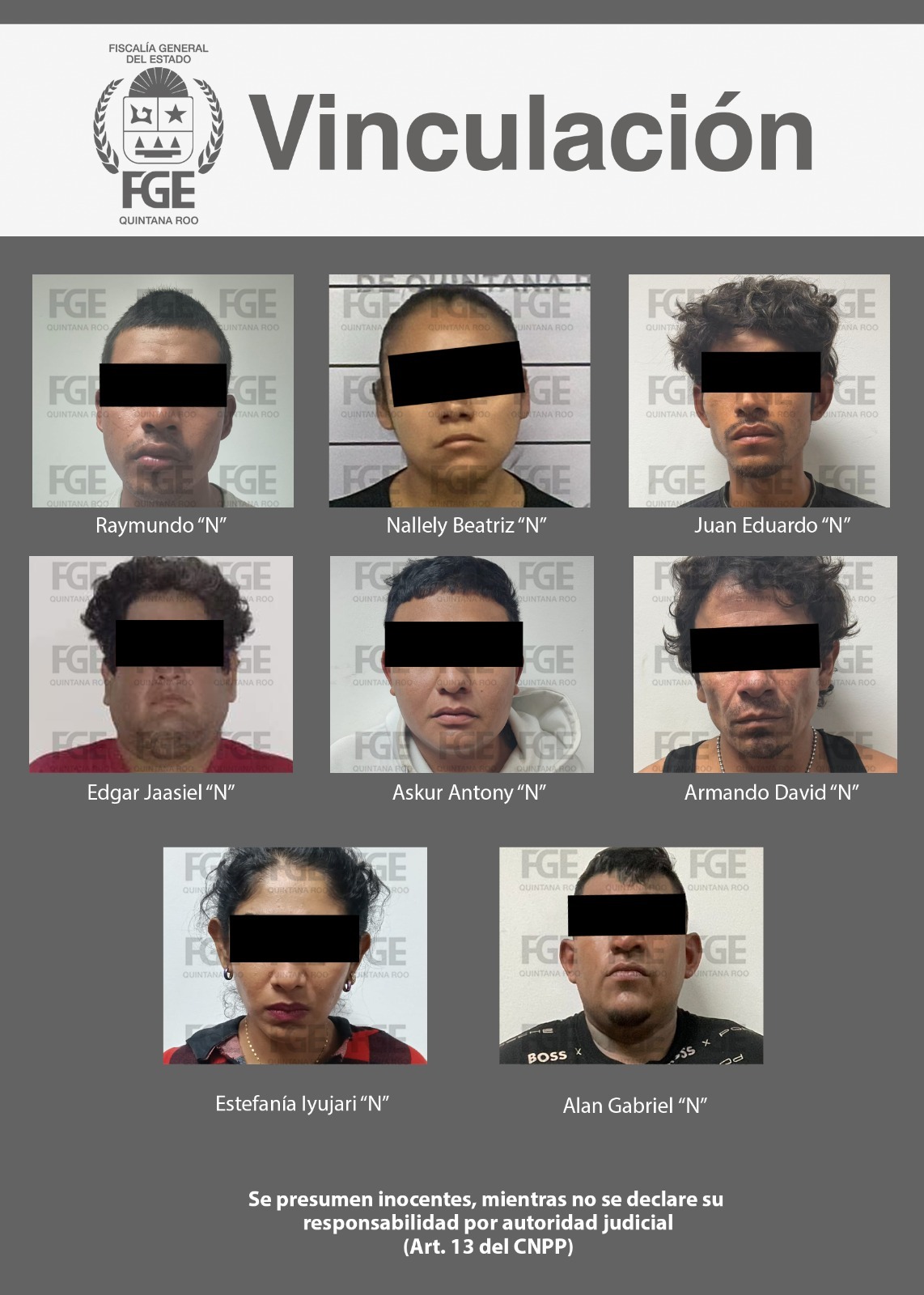 Benito Juárez.- Luego de que la Fiscalía General del Estado, a través de la Fiscalía Especializada en Combate al delito de narcomenudeo, aportara los datos de prueba pertinentes, en audiencias separadas, jueces de Control dictaron el auto de vinculación a proceso para ocho personas, por su presunta relación en hechos posiblemente constitutivos de delitos contra la salud, en su modalidad de narcomenudeo, en este municipio.