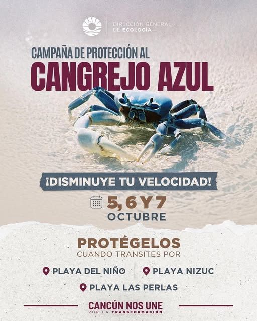 Cancún, Q. R., a 03 de octubre de 2025.- El Ayuntamiento de Benito Juárez, a través de la dirección de Ecología Municipal, invita a la ciudadanía a participar en la campaña de protección al cangrejo azul, que se realizará del 5 al 7 de octubre.