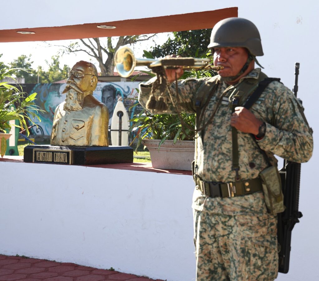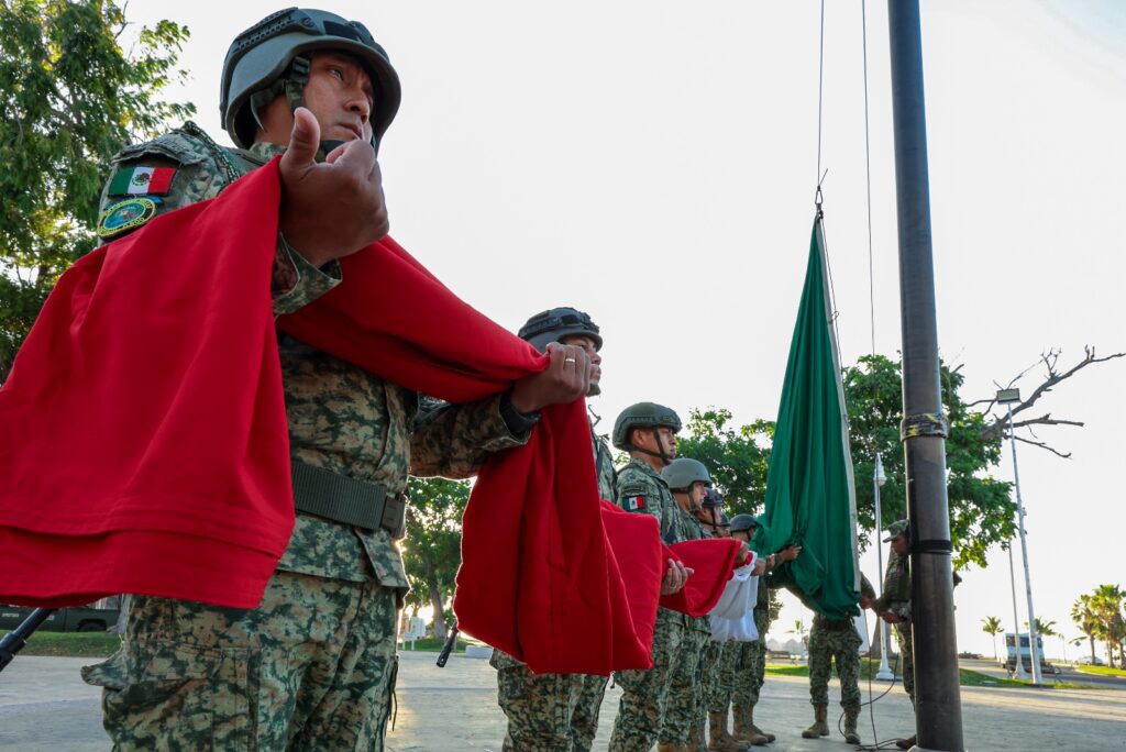 Antes de llevar a cabo la ceremonia cívica, elementos de la 34 Zona Militar izaron el Lábaro Patrio a toda asta en la plaza de la bandera, situada frente al Palacio de Gobierno.