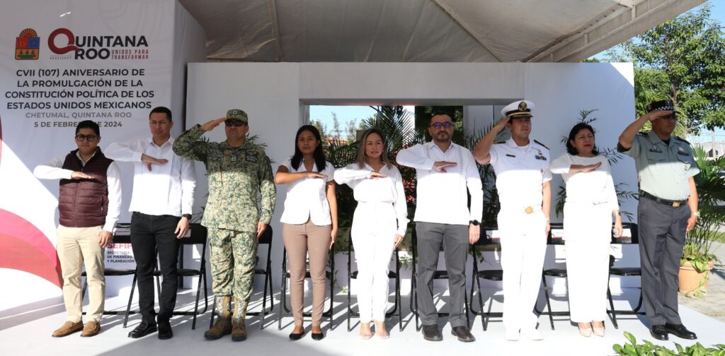Chetumal.- Para conmemorar en Chetumal el 107 Aniversario de la promulgación de la Constitución Política de los Estados Unidos Mexicanos, el Gobierno de Quintana Roo, a través de la Secretaría de Finanzas y Planeación (SEFIPLAN), realizó una ceremonia cívica en el Parque de las Casitas, con la asistencia de funcionarios y servidores públicos de diversas instituciones de los tres niveles de gobierno y público en general.