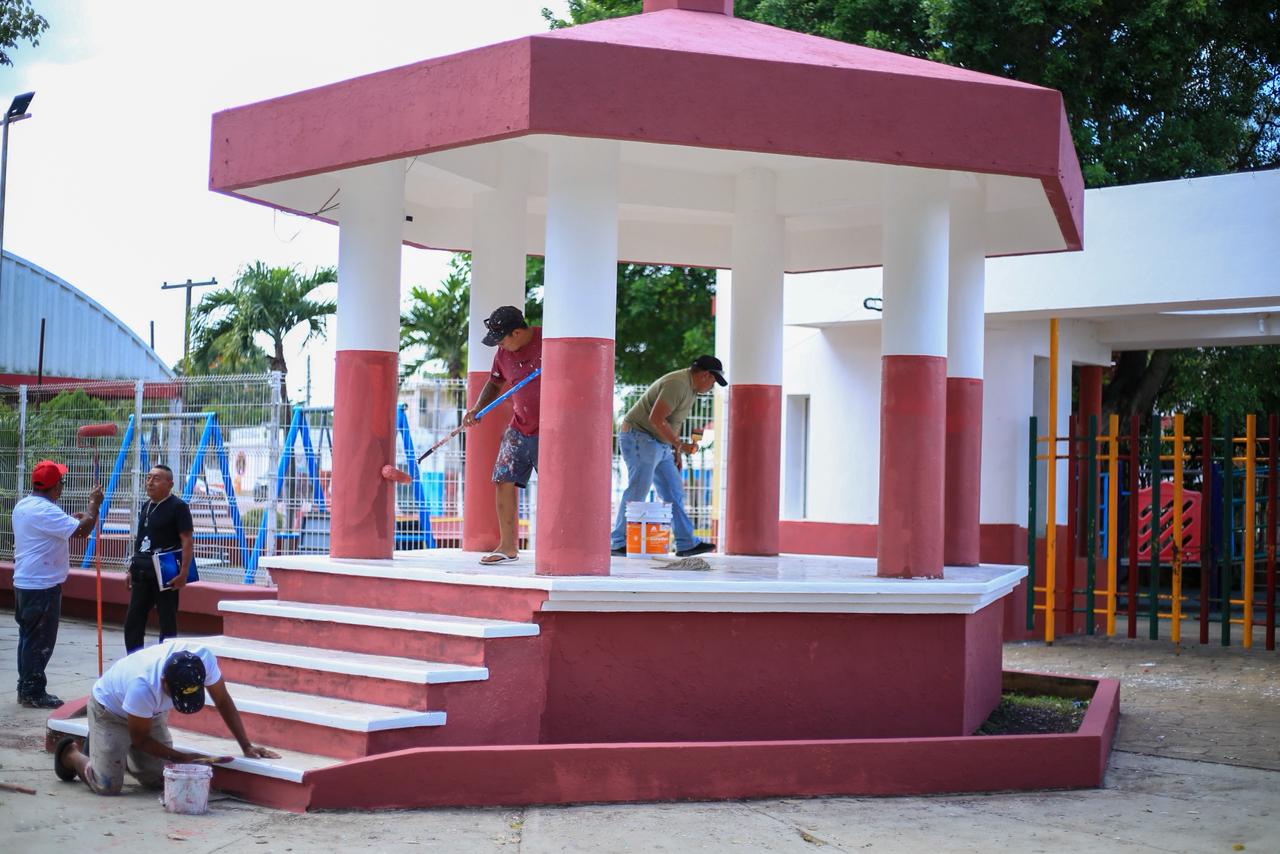 Kantunilkín. 11 de Febrero del 2026.-Ante la cercanía del arranque del Carnaval 2026, personal del Ayuntamiento remoza el parque principal pintando todas las bancas y paredes para darle una mejor imagen a las miles de personas que acudirán a disfrutar de estas actividades.