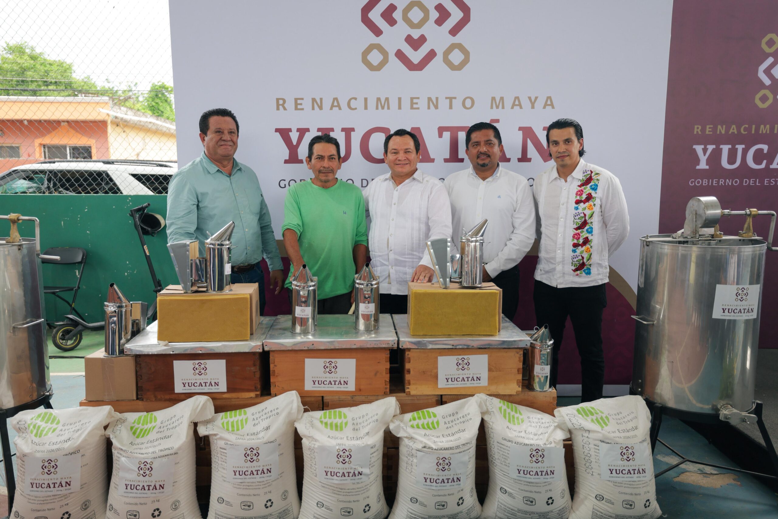 Desde la Unidad Deportiva Fernando Novelo, en Valladolid, informó que se entregaron más de mil insumos a productoras y productores apícolas, incluyendo azúcar, guantes, cajas para colmenas, entre otros materiales.