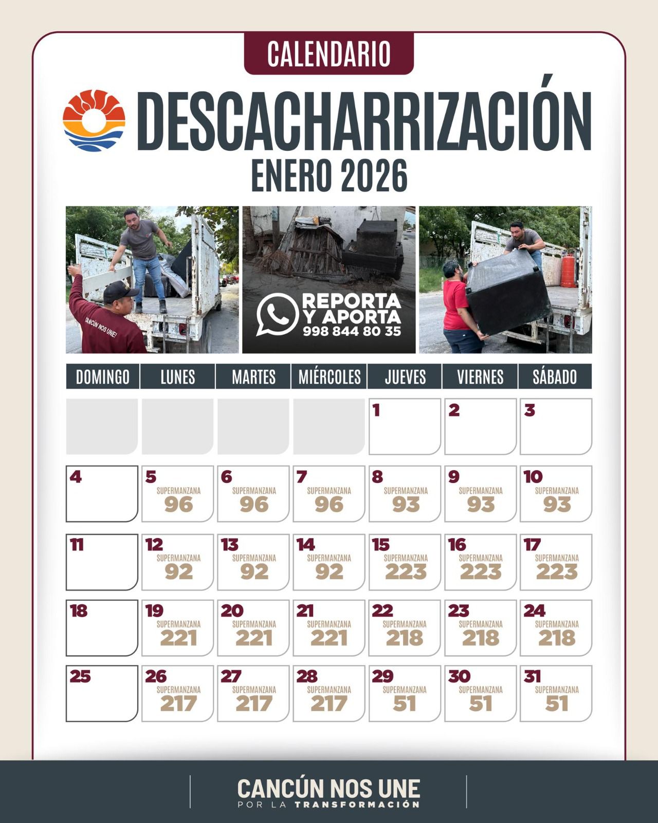 Cancún, Q. R., a 11 de enero de 2026.- El Ayuntamiento de Benito Juárez, a través de la Dirección de Servicios Públicos, emitió su calendario mensual del programa de Descacharrización, para que durante enero los ciudadanos depositen debidamente muebles, electrónicos y diferentes artículos en desuso para mantener una ciudad más limpia y libre de focos de infección.