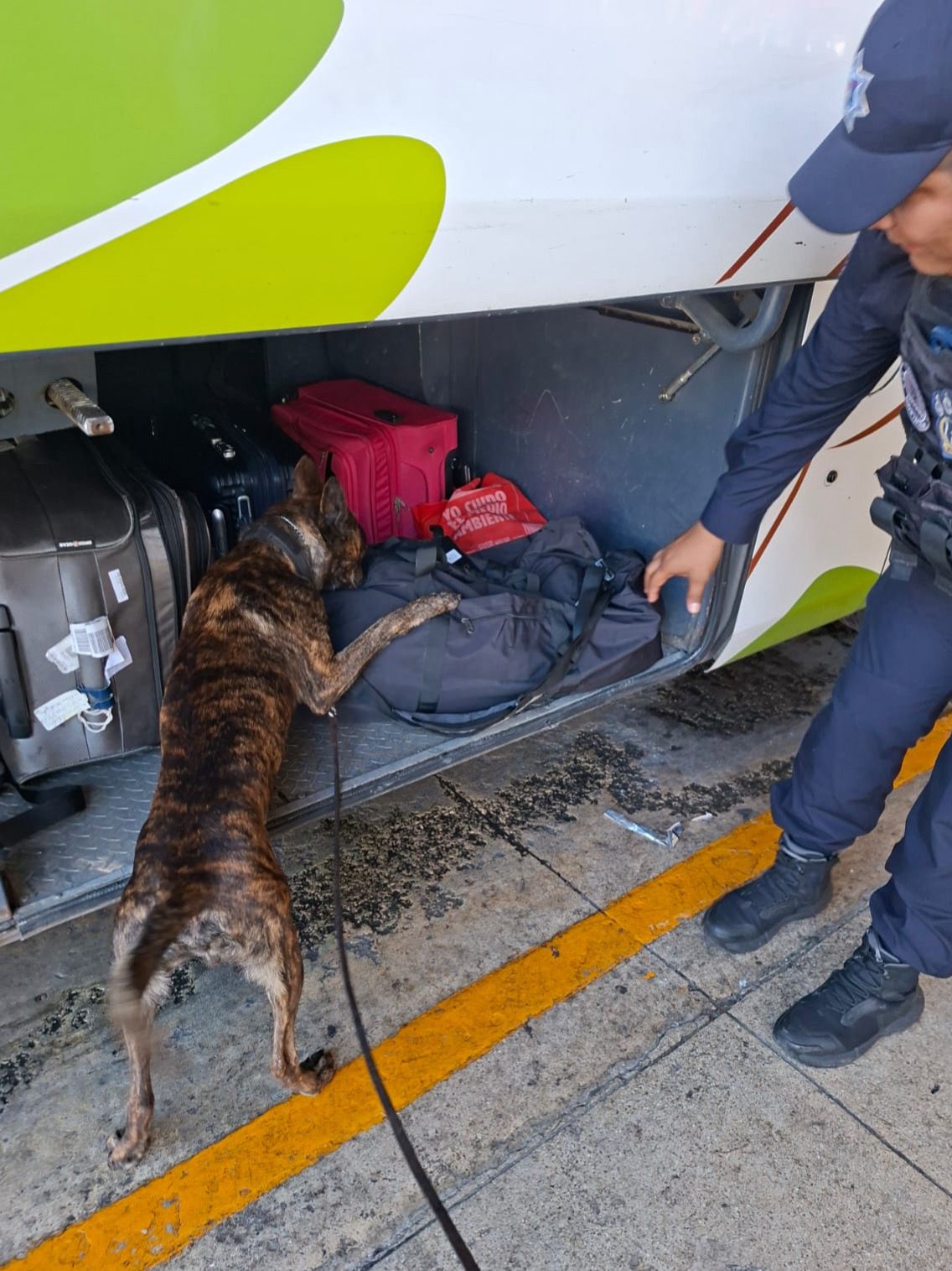 Los hechos ocurrieron en el área del maletero de uno de los autobuses, en donde el binomio canino comenzó a realizar cambios de actitud, moviendo la cabeza de un lado a otro, con jalones y ladridos, esto en señal de que estaba percibiendo un aroma propio de narcóticos, realizando un marcaje positivo sobre una maleta de color negro.